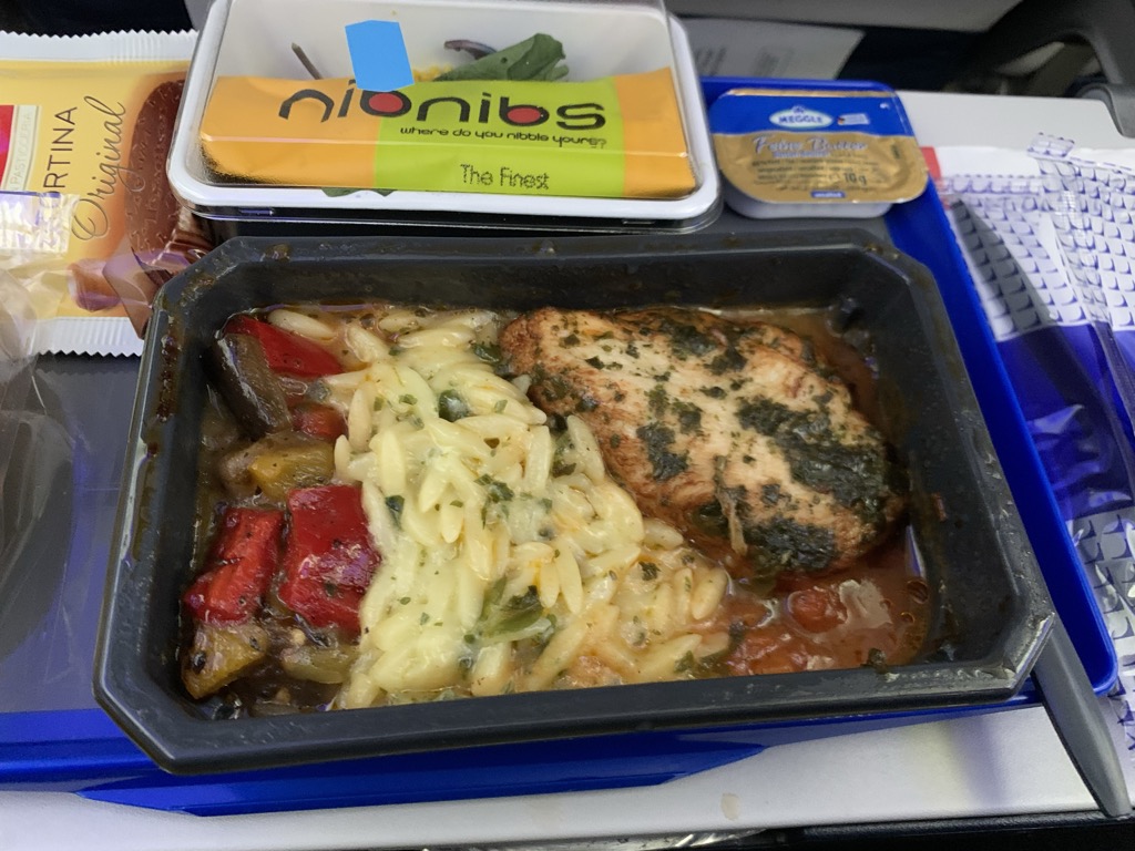 Das Essen wird wie üblich bei United Airlines in der Ecnoomy Class auf einem kleinen Tablett serviert und besteht aus einem Brötchen, einem Salat und einem warmen Hauptgericht. Dabei hat man bei United Airlines weiterhin die Wahl aus zwei Hauptspeisen.