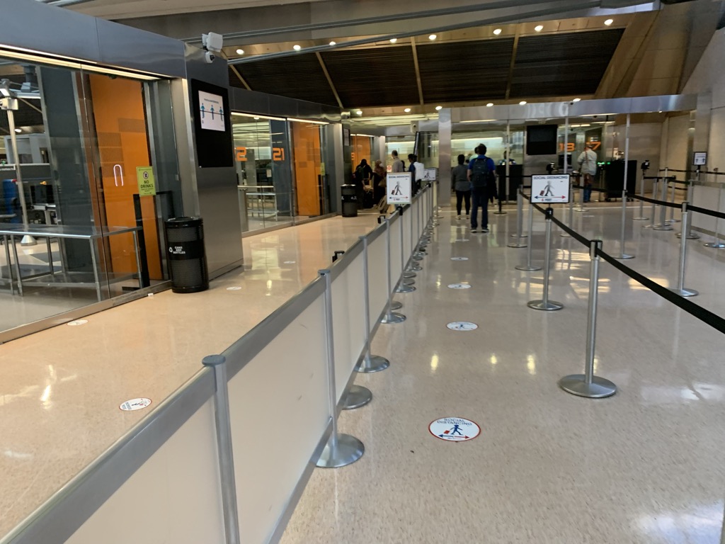 Auch in den USA hat sich inzwischen das Tragen von Masken weitestgehend durchgesetzt und am Flughafen gilt eine generelle Maskenpflicht, welche auch kontrolliert wird und von den Passagieren in D.C. sehr gut eingehalten wurde. Zusätzlich sind auf dem Boden Markierungen, welche auf sechs Fuß (knapp 2 Meter) Abstand hinweisen. Dass man diesen in der Warteschlange grundsätzlich nur nach vorne aber nicht zur Seite einhalten konnte sei einmal dahin gestellt, daher tragen wir ja die Masken.
