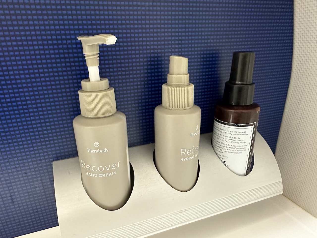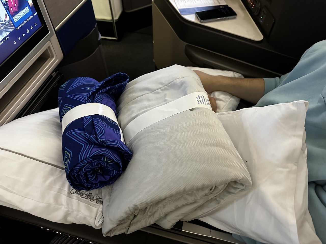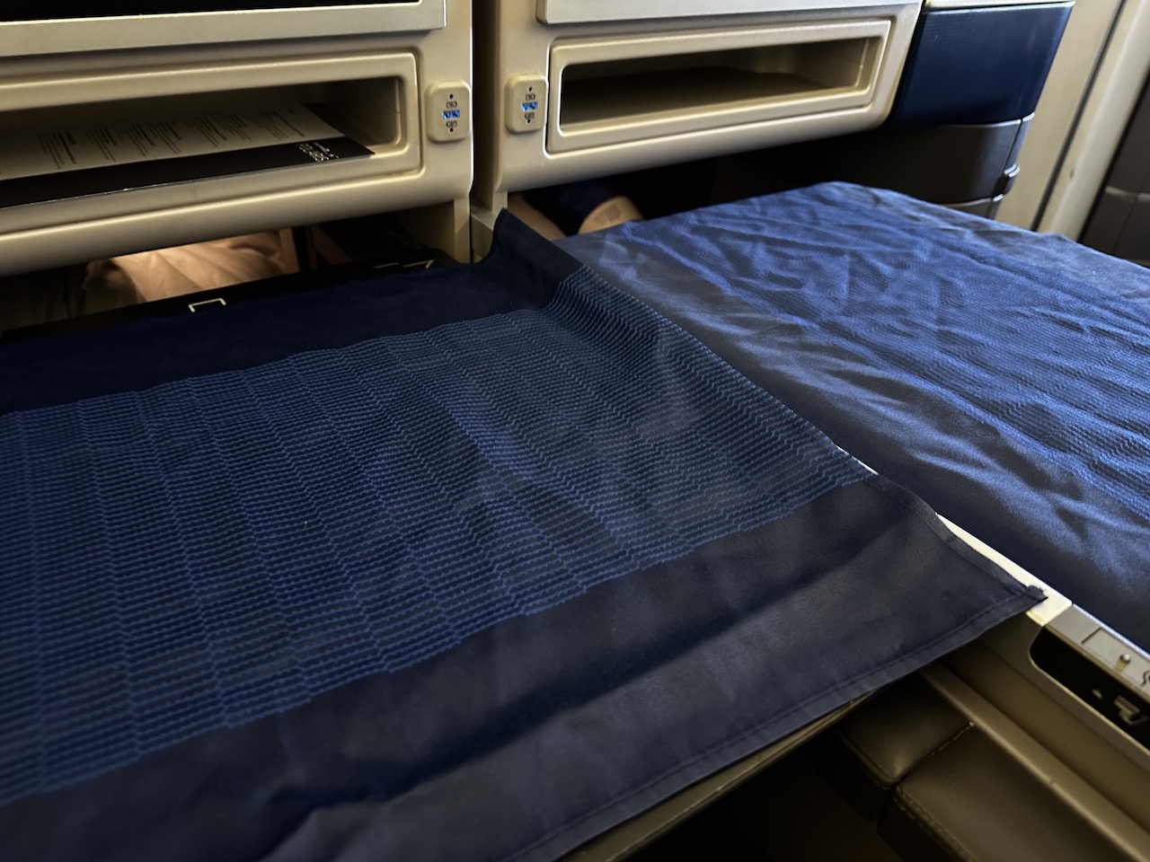 Auf den Sitzen lagen jeweils zwei Kissen und zwei Decken, auch Kopfhörer, Amenity Kit, Wasserflasche und Speisekarte waren da.