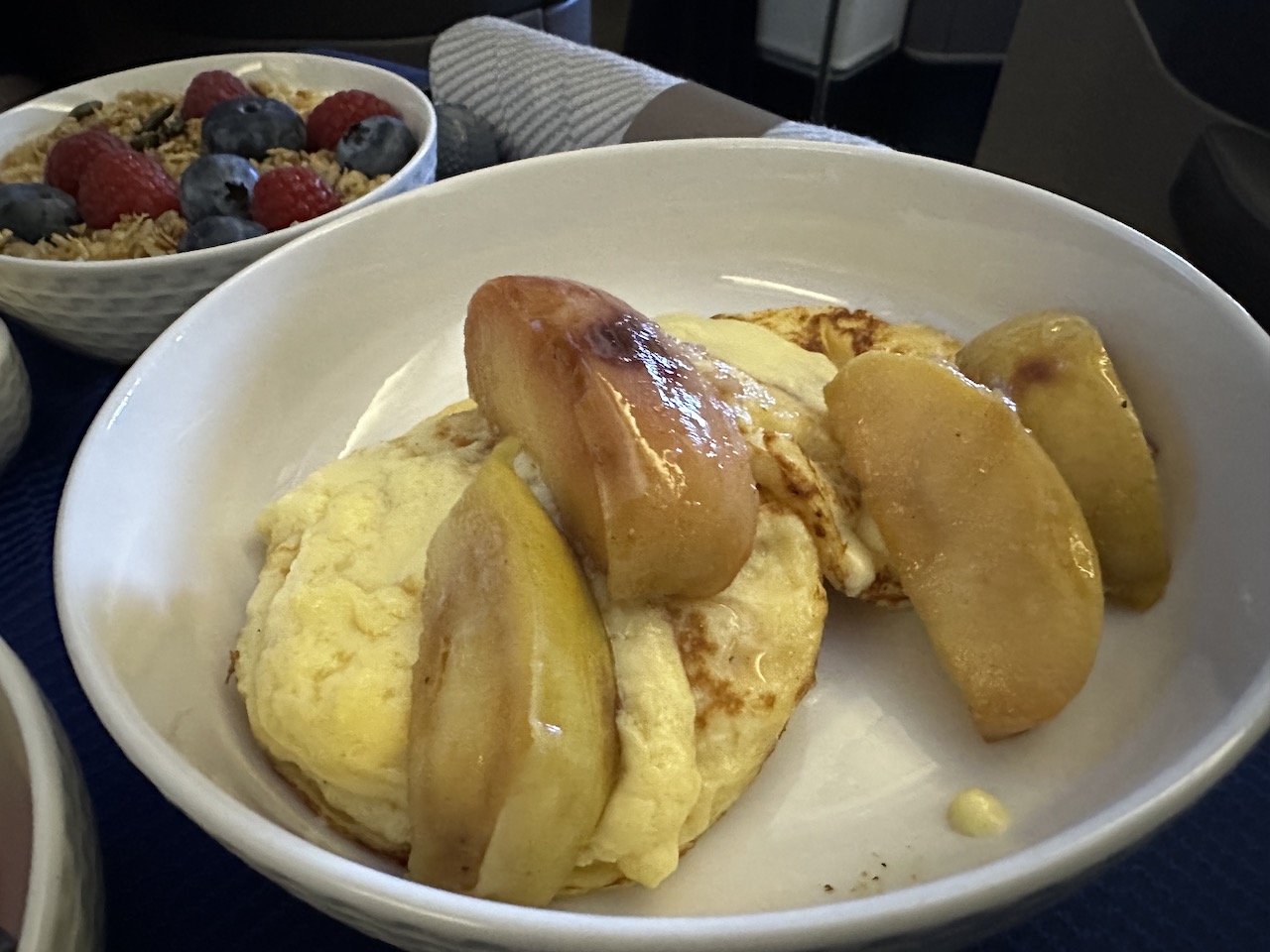 Leider waren die Flugbegleiter nur untereinander gesprächig, die Stimmung war den Gästen gegenüber fast schon kalt. Nach einem Aperitif mit Nüssen kam das Frühstück inkl. Obst und Müsli auf einem Tablett.