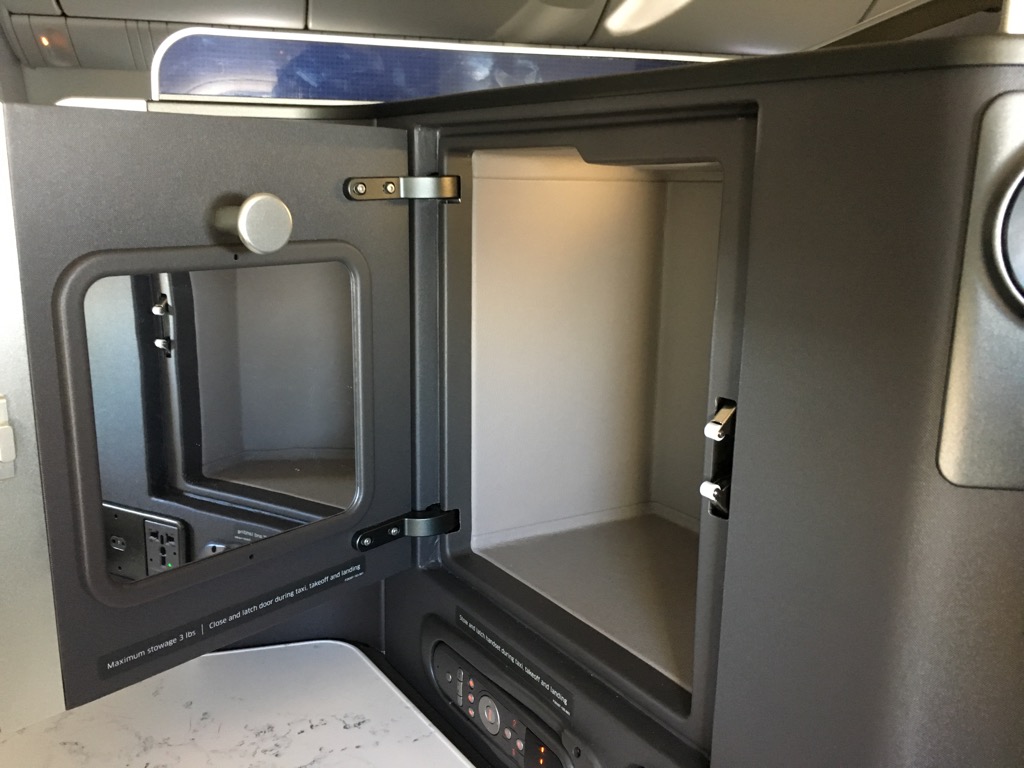 Was mir als erstes am United Polaris Business Class Sitz in der Boeing 777-300er sehr positiv aufgefallen ist, war der viele Stauraum. Unter dem Monitor, im Ablagefach neben dem Sitz oder unter der Armlehne ließ sich problemlos alles verstauen, was man während dem Flug bei sich hat.