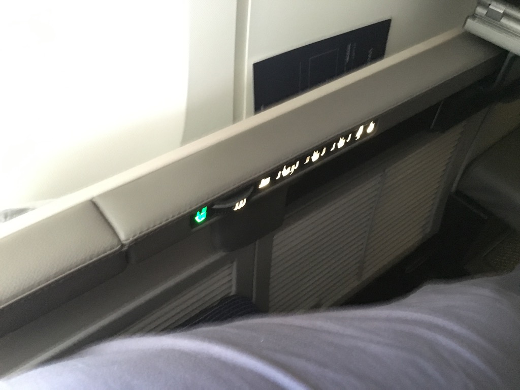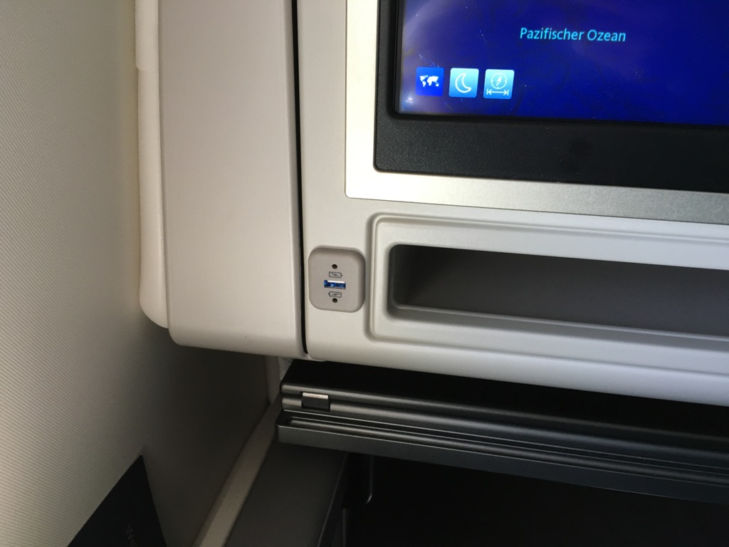 Wie es sich für einen moderen Business Class Sitz gehört, gab es direkt neben dem Sitz eine internationale 110V Steckdose, sowie einen weiteren USB Anschluss unter dem Fernseher. Hier konnte man von seinem Smartphone oder Tablett auch Bilder und Filme auf dem Bildschirm des Sitzes anschauen.