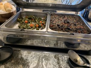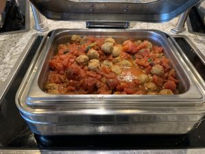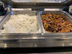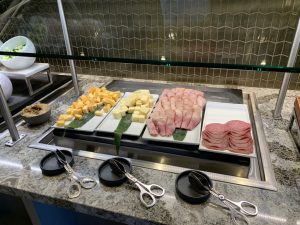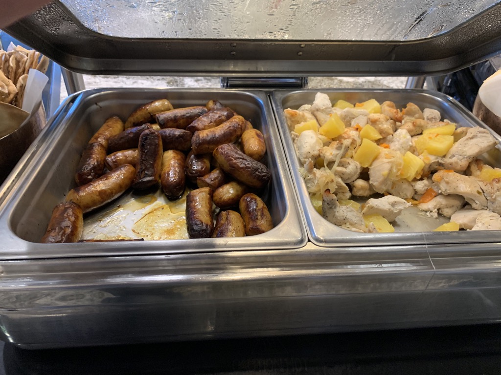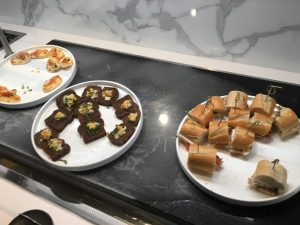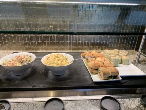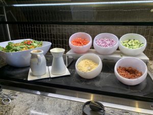 An einem recht kleinem Buffet im Zentrum der Lounge kann man sich an einer guten Auswahl an warmen und kalten Speisen selbst bedienen. Hierbei gibt es immer eine große Salatbar, Sandwiches, sowie wechselnde warme Hauptspeisen und Desserts.