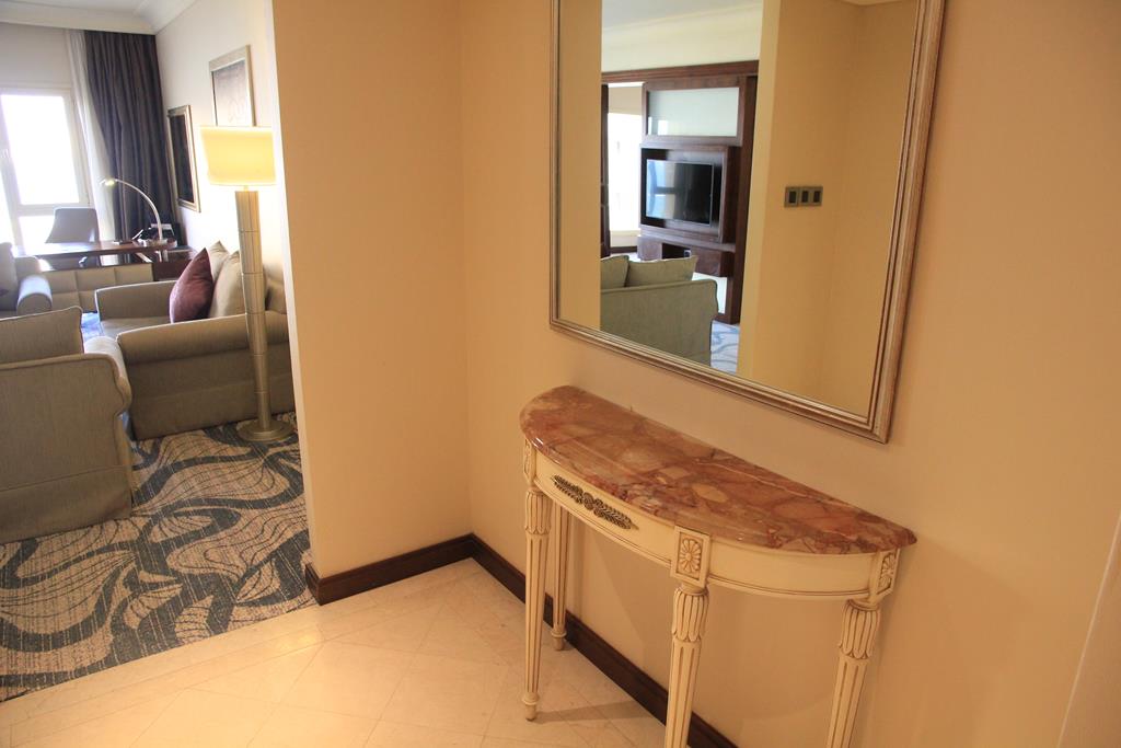 Wenn man die Suite betritt, dann befindet man sich zunächst in einem kleinen Eingangsbereich. Hier befindet sich ein Wandtisch auf dem man Kleinigkeiten ablegen kann. Gegenüber befindet sich eine Garderobe. Wobei dies eher mit einem begehbaren Kleiderschrank verglichen werden kann. Zudem befindet sich hier auch ein kleines Badezimmer.