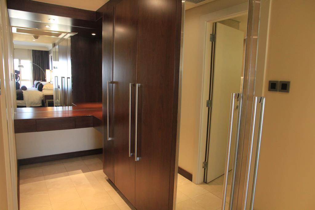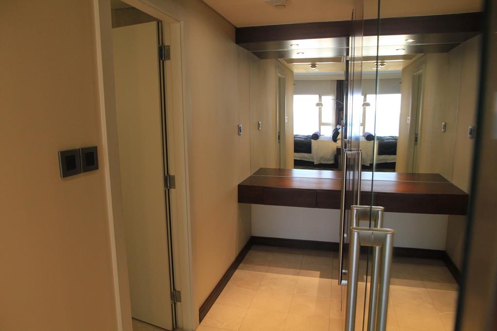 Der Durchgang zum Badezimmer war als begehbarer Kleiderschrank gestaltet. Auf der linken Seite hatte man genügend Möglichkeiten, um seine Koffer und Kleidung zu verstauen. Im hinteren Bereich befindet sich zudem ein großer Schminkspiegel.