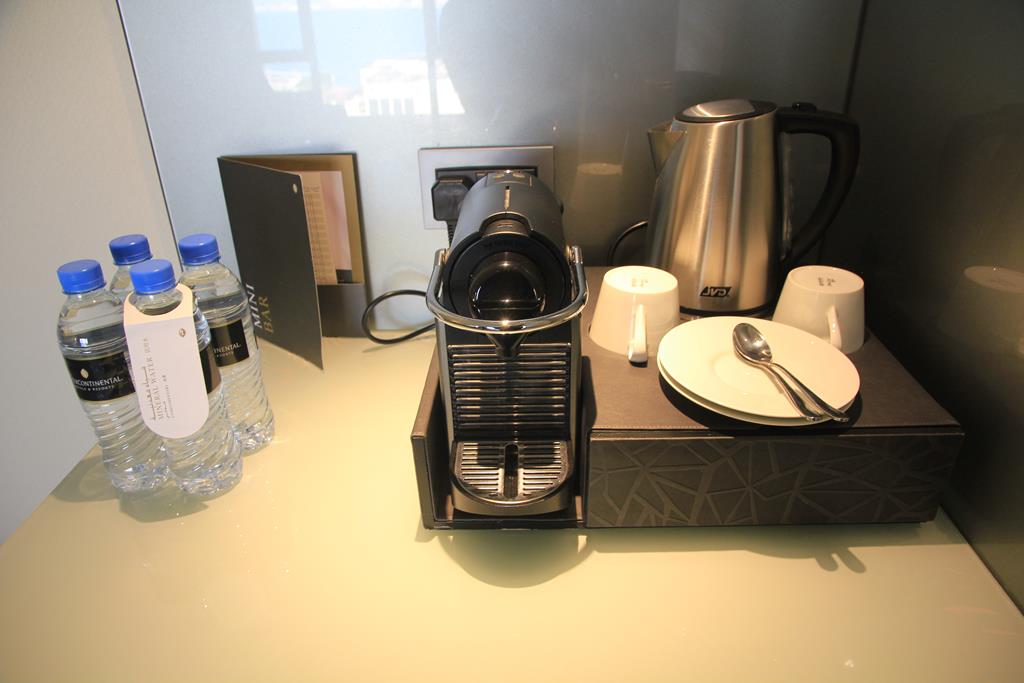 Auf der rechten Seite befindet sich eine Minibar mitsamt Nespresso-Maschine und kostenfreiem Wasser. Der Kühlschrank war gut gefüllt. Die Preisgestaltung fand ich aber ziemlich sportlich. Eine Tüte Chips für acht Euro oder ein Bier für gut zehn Euro sind mir persönlich dann doch zu viel.