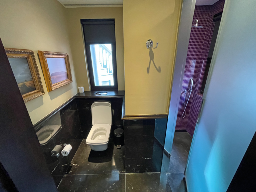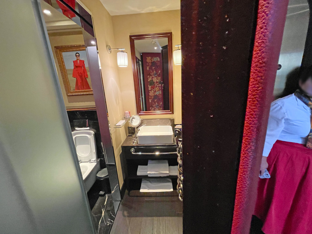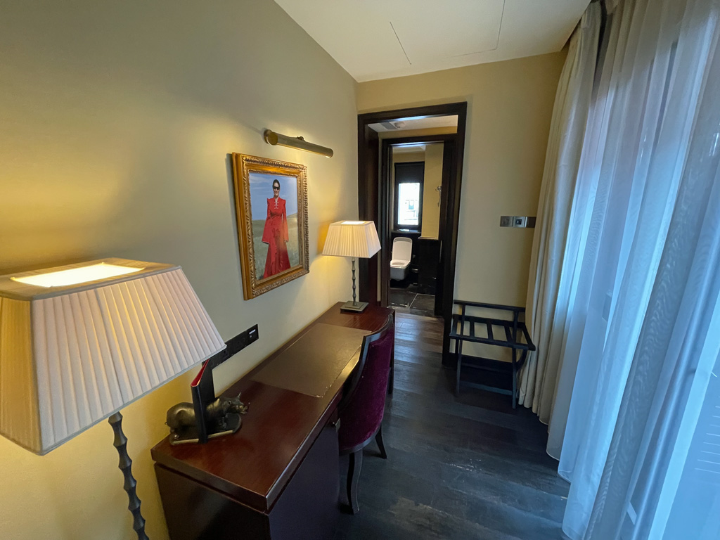 Das Upgrade hat sich spürbar ausgezahlt. Das Zimmer war überraschend geräumig. Wobei der Begriff  „Zimmer“ nicht zutreffend ist, denn es handelte sich um mehrere kleine Räume. Zum einen den Mini-Eingangsbereich, der so klein ist, dass man schon fast im Schlafraum steht. Im Schlafraum dominiert das große King Size Bett. Hinter dem Schlafraum ging es durch einen schmalen Gang mit Schreibtisch und Kofferablage in ein kleines Bad und dann weiter in jeweils einen eigenen Raum für die Toilette bzw. Dusche. Zum Innenhof ging es durch eine Schiebetür aus dem Durchgang mit Schreibtisch.