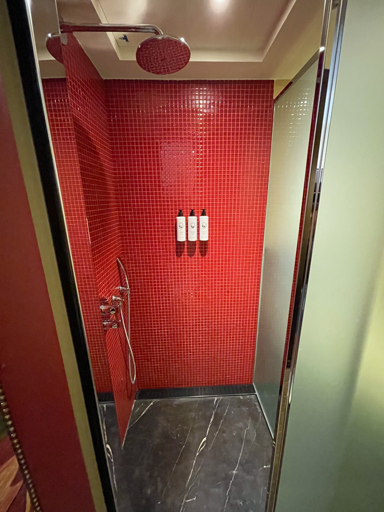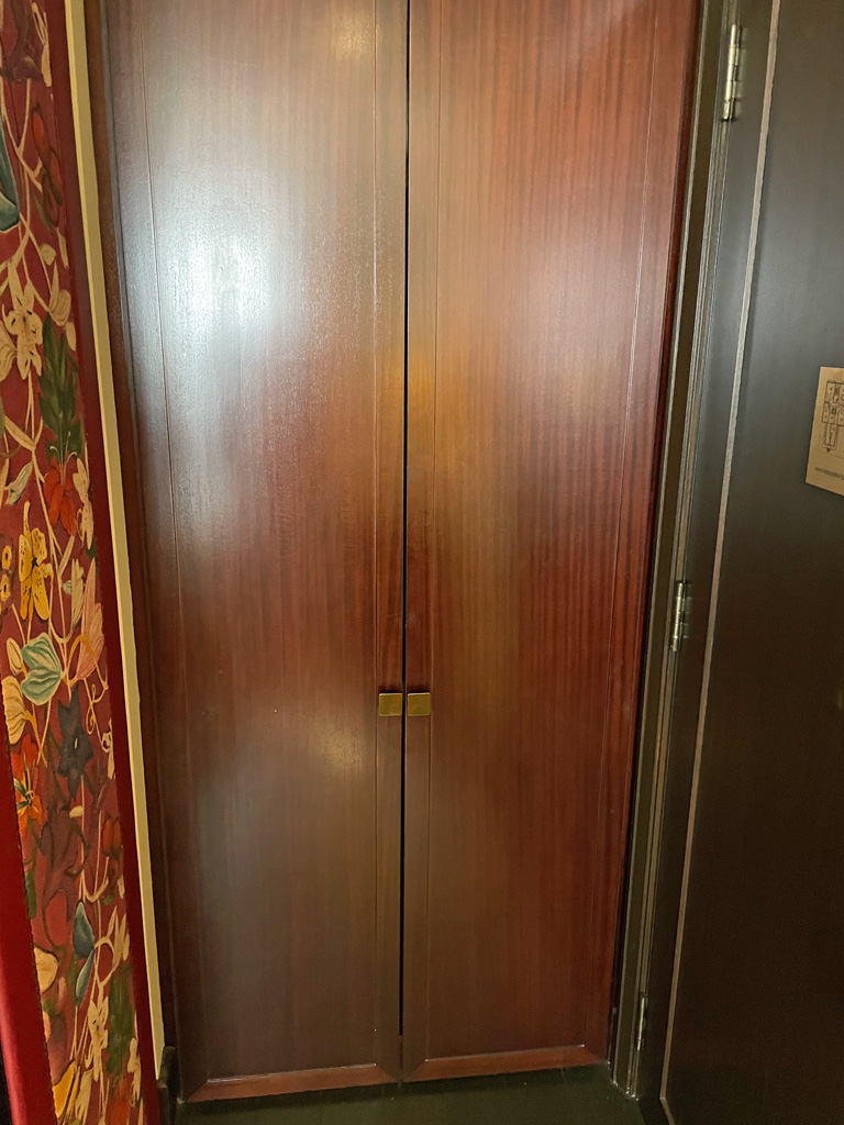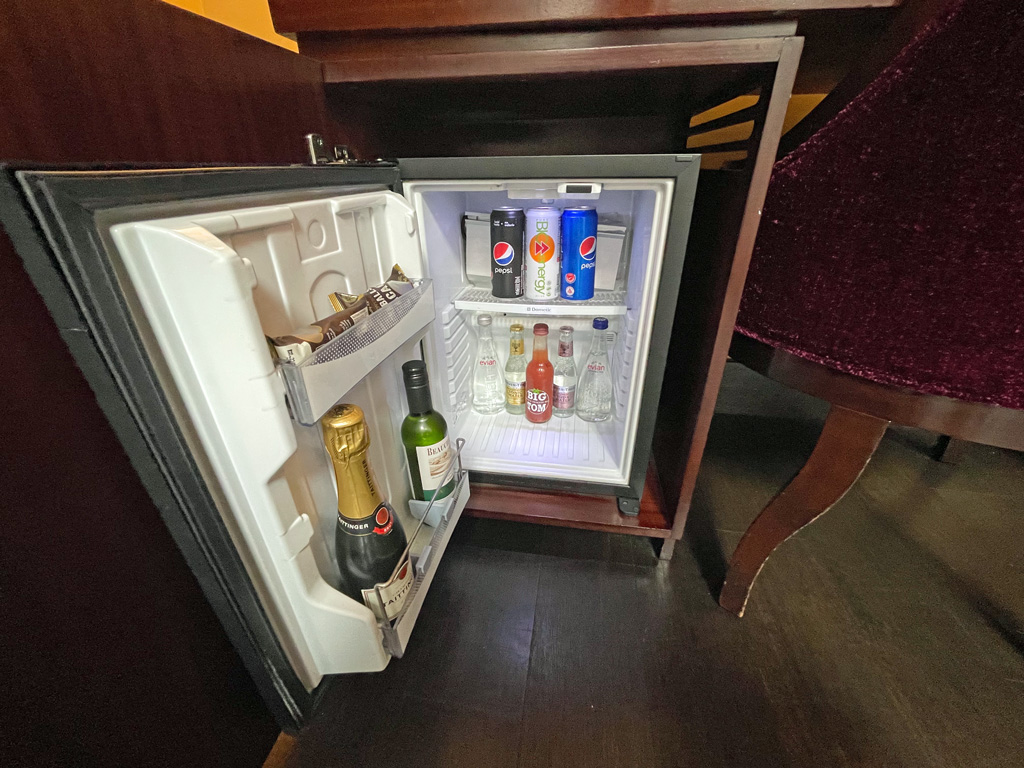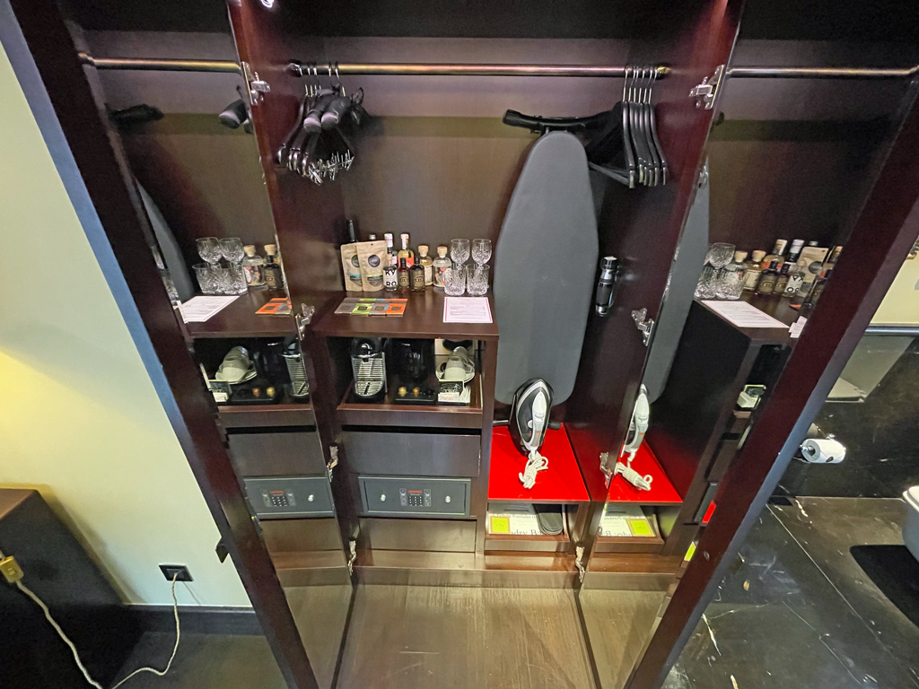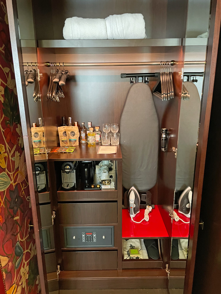 Auf dem Zimmer gibt es im Kleiderschrank eine exzellent gefüllte Minibar. So gibt es Single Malt Whisky, drei verschiedene Gins (in gar nicht mal so kleinen Flaschen) usw. Allerdings alles zu Preisen, die sich gewaschen haben. Eine Dose Pepsi Cola kostet inkl. Steuern und Service Charge ca. 10 Euro. Unter der Minibar befinden sich noch eine Nespresso Kaffeemaschine und ein Wasserkocher mit dem jeweils notwendigen Zubehör. Noch weiter darunter gibt es einen kleinen Safe. Bei meiner Ankunft war die Batterie des Safes leer, sodass ich ihn nicht verwenden konnte. Der Tausch der Batterie hat mich dann ca. 20 Minuten ans Zimmer gefesselt, da der Hausmeister immer wieder rein und raus musste. Allerdings erschien er wenige Augenblicke nach meinem Anruf an der Rezeption.