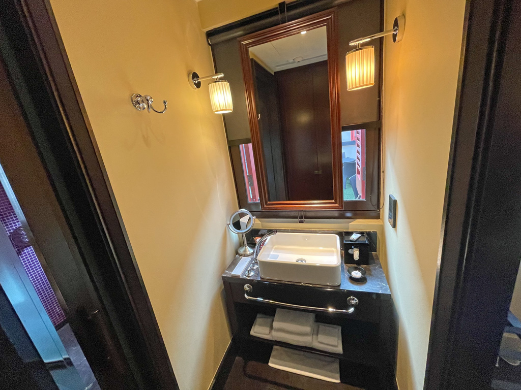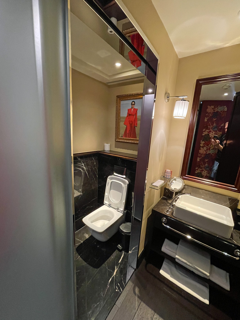 Die Pflegeprodukte im Zimmer sind von der französischen Marke Diptyque. Das ist dieselbe Marke, die gegenwärtig bei Qatar Airways in den Amenity Kits und den Lounges am Flughafen steckt. Scheinbar hat sie ETRO abgelöst, von denen noch das Nähset war. Vielleicht kennt Ihr ETRO aus den First Class Lounges von Lufthansa.