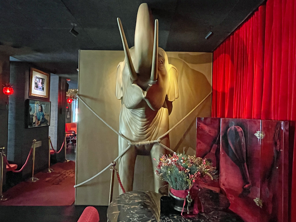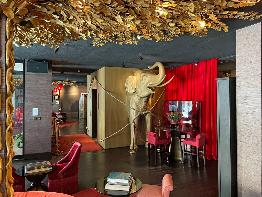 So langweilig das Hotel von außen aussehen mag, so aufregend ist es von innen. Bereits im Eingang sieht man Büsche, die als herumtollende Hunde getrimmt sind. Sobald man einen Schritt ins Hotel macht, wird es dunkel. Die dominierende Farbe ist dann Schwarz. Mit ein paar goldenen und roten Akzenten. Wie bereits erwähnt, ist der „Front Desk“ ein goldenes Rhinozeros. Gegenüber ist der Aufzugschacht mit zwei goldenen Elefanten verkleidet.