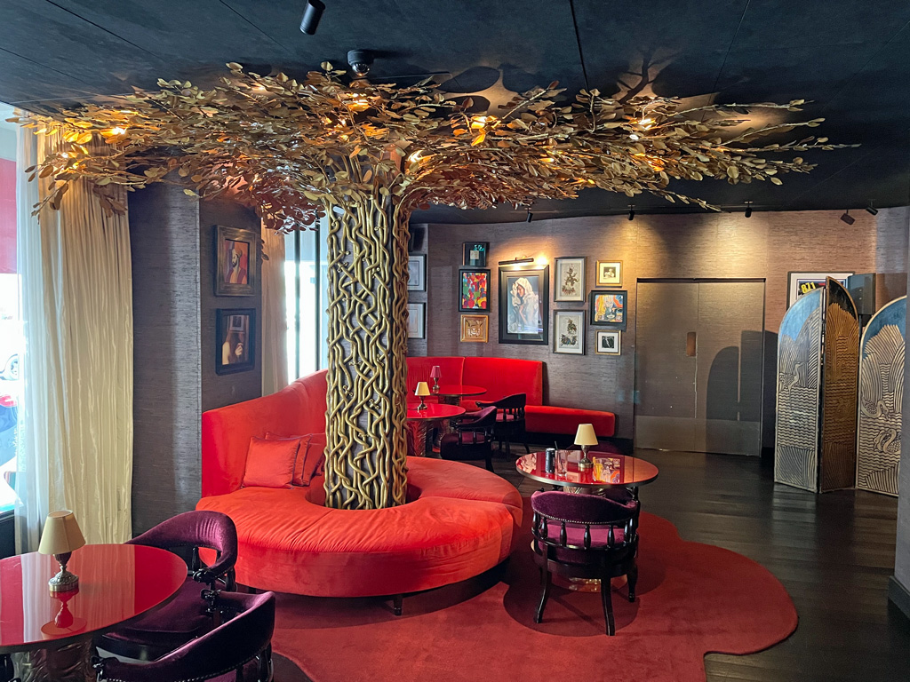 Säulen im Erdgeschoss sind als bewucherte Bäume verkleidet – mit jeweils hunderten goldenen Blättern an der Decke.