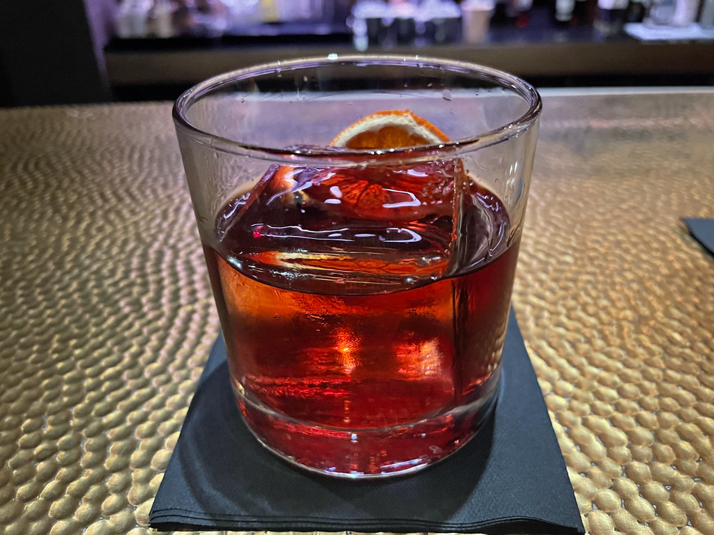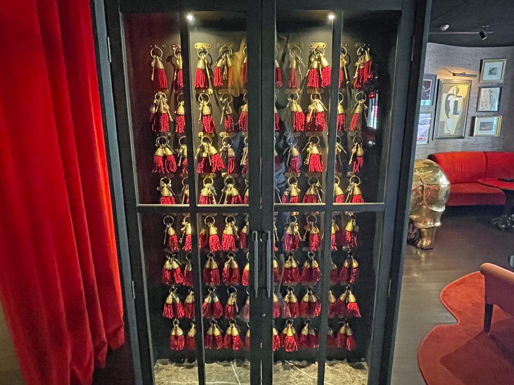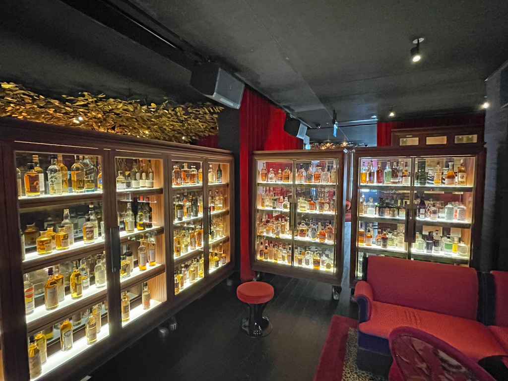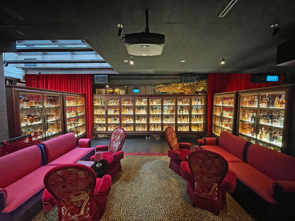 Hinter einem roten Vorhand liegt das Restaurant (bzw. der Club aka die Lounge) verborgen. Geht Ihr hindurch, fällt Euer Blick zwangsläufig auf die Vitrinen voller Whisky(e)y. Der Vagabond Club rühmt sich mit Singapurs umfangreichster Whisky/Whiskeysammlung. Sie soll mehrere hundert verschiedene Sorten umfassen. In einer weiteren Vitrine befinden sich die Schätze der regelmäßigen Clubmitglieder, die hier ihre Lieblingssorten in privaten Flaschen verwahren lassen.