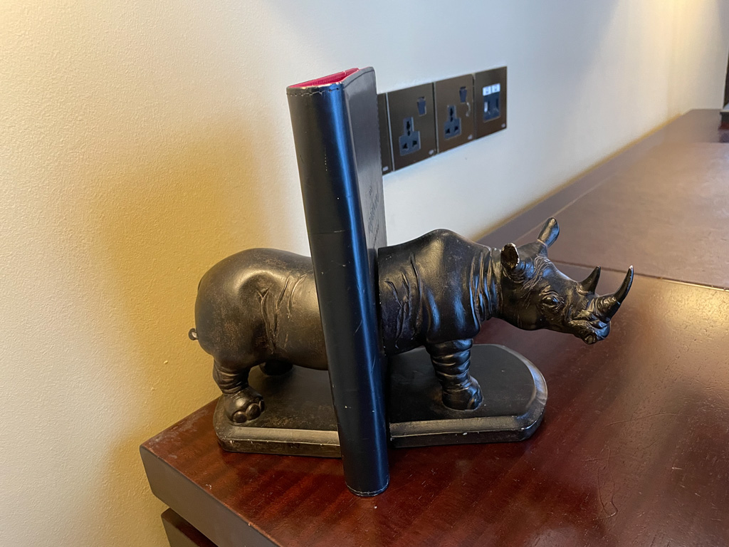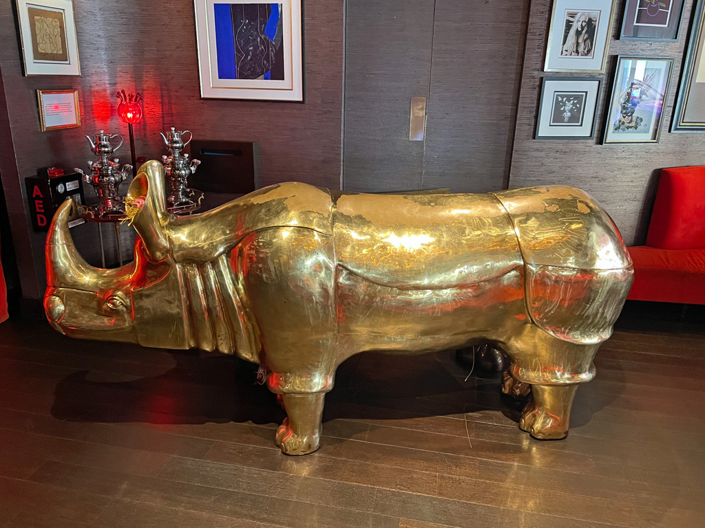 Im Hotel ist die Rezeption gar nicht so leicht auszumachen, denn bei ihr handelt es sich um einen Tisch in Form eines goldenen Nashorns.