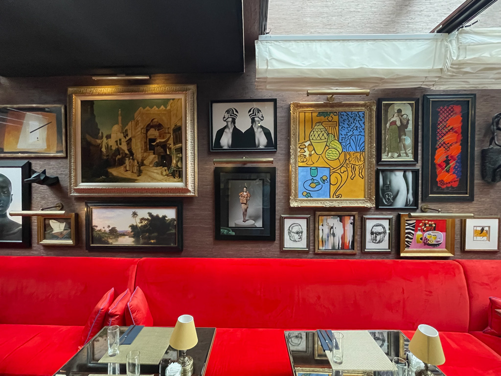 Der Boden ist mit dunklen Fliesen in Holzoptik eingerichtet, die Wände mit den vielen gerahmten Fotos sind gelb, die Decken weiß. Holzgegenstände sind in dunklen Tönen gehalten. Teppiche und Polster sind dunkelrot.