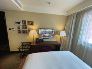 Das Upgrade hat sich spürbar ausgezahlt. Das Zimmer war überraschend geräumig. Wobei der Begriff „Zimmer“ nicht zutreffend ist, denn es handelte sich um mehrere kleine Räume. Zum einen den Mini-Eingangsbereich, der so klein ist, dass man schon fast im Schlafraum steht. Im Schlafraum dominiert das große King Size Bett. Hinter dem Schlafraum ging es durch einen schmalen Gang mit Schreibtisch und Kofferablage in ein kleines Bad und dann weiter in jeweils einen eigenen Raum für die Toilette bzw. Dusche. Zum Innenhof ging es durch eine Schiebetür aus dem Durchgang mit Schreibtisch.