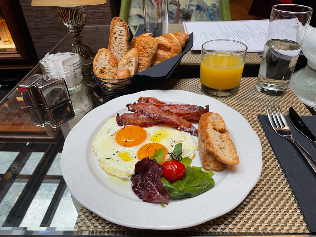 Beim Frühstück sieht es ähnlich aus wie bei der „Lounge“. Man darf sich ein paar Gerichte vom Menü gratis aussuchen. Ich entschied mich für das Continental Breakfast. Das war alles, nur nicht „Continental“ im amerikanischen Sinne. Hier gab es dann Spiegelei, Speck und einen ganzen Brotkorb. Lecker war es obendrein noch. Allerdings war der Lassi nicht verfügbar, so dass ich einen Orangensaft als Ausweuchgetränk gewählt habe.