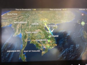Dann sah ich einen A350 an einem Gate. Könnte das mein Flugzeug sein? Auf einmal wurde es hektisch: Mitarbeiter von Vietnam Airlines hielten Plakate mit drei Flugnummern an einem Gate hoch. Meine war auch mit dabei. Leider erreichte ich das Gate nicht so früh wie gehofft. Denn die Szenen, die sich abspielten waren kurios, denn: man hatte sich entschieden die drei Flüge auf einem zu konsolidieren. Sitzplätze mussten neu verteilt und Bordkarten neu gedruckt werden. Mit meinem Platz am Notausgang des Dreamliners war es sowieso geschehen. Hauptsache mitkommen war jetzt das Gebot der Stunde. Ich bekam einen Sitzplatz am Gang, recht weit hinten. Es hätte schlimmer kommen können.