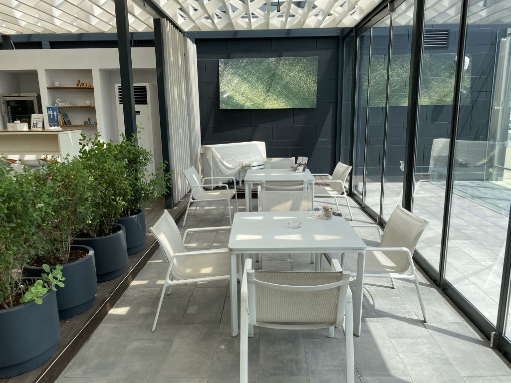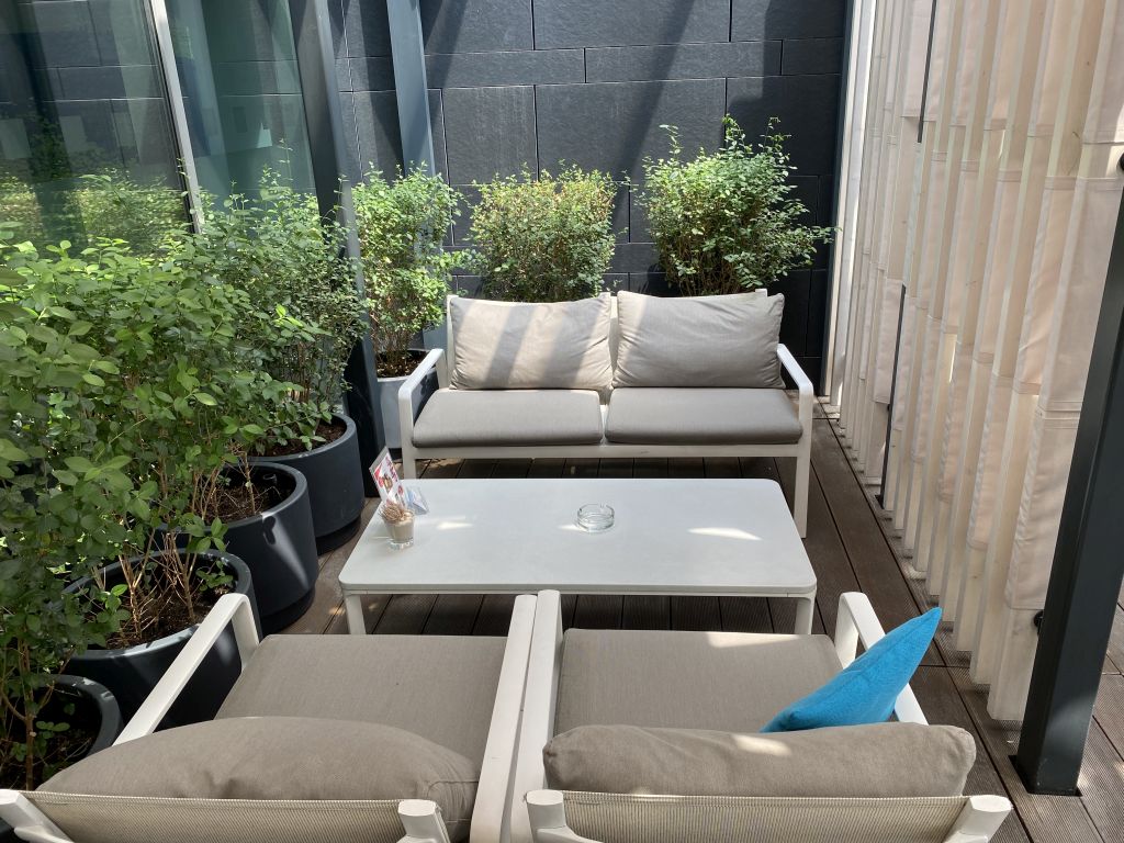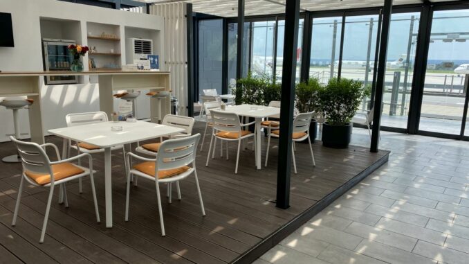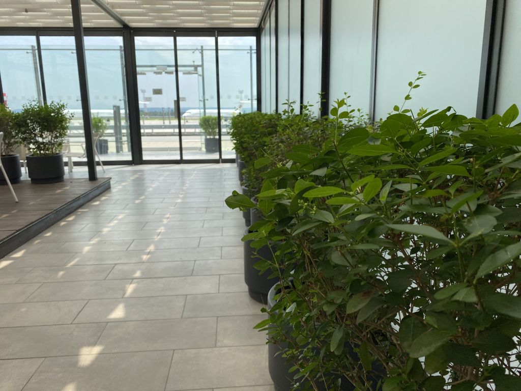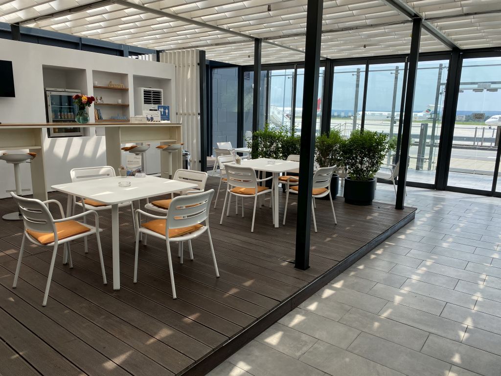 Wer Zwischendurch etwas Luft schnappen oder eine Zigarette rauchen möchte, der gelangt durch eine Glastür auf die Terrasse. Hier steht Ihr schon fast auf dem Rollfeld und theoretisch wäre sogar ein Boarding durch die Lounge möglich. Ich vermute, dass das bei Buchung entsprechender VIP-Pakete auch genauso durchgeführt wird.