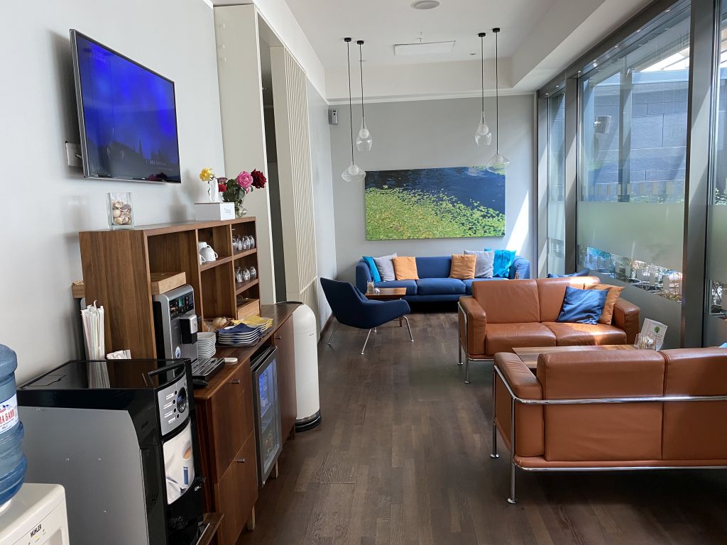 Zwei Gäste und drei Mitarbeiter im Service. Kein schlechtes Verhältnis, wobei die Mitarbeiter die meiste Zeit im Bereich der Rezeption verbrachten. Der Checkin in der Lounge war einfach und schnell erledigt. Die digitale Karte aus meiner Priority Pass App wurde akzeptiert und wir durften recht wortkarg die Lounge betreten.