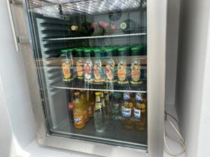Den aufkommenden Durst konnten wir mit Heißgetränken aus dem Automaten oder den bereitstehenden Wasserspendern stillen. Darüber hinaus standen noch zwei Kühlschränke mit Softdrinks zur Verfügung. Der Kühlschrank im Bereich der Bar war zusätzlich auch noch mit Bier und Wein gefüllt. Harten Alkohol gab es während unseres Besuches jedoch nicht.