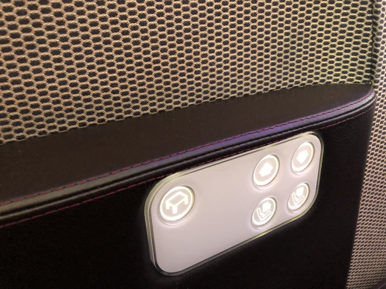 Auf Wunsch bereiten die Flugbegleiter den Sitz in ein Bett, Matratzen und Wäsche sind bereits hinter der Rückenlehne verstaut. Auffällig in der Kabine ist das Lichtkonzept, die Beleuchtung war meist gut abgedimmt, es befinden sich zahlreiche dekorative Elemente mit indirekter Beleuchtung.