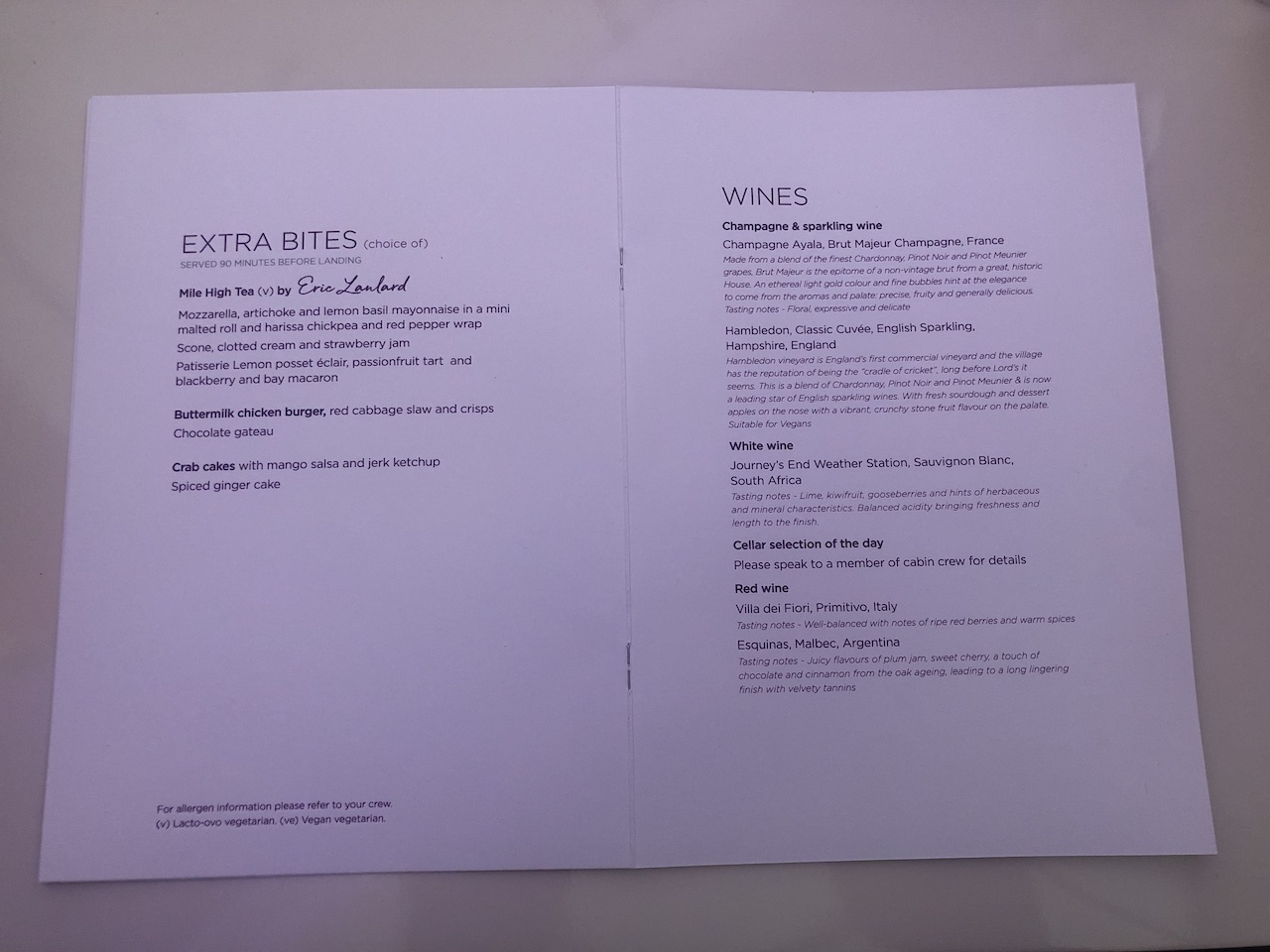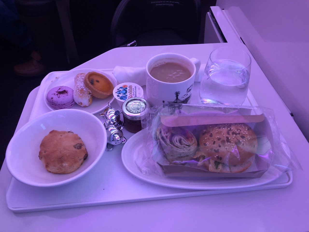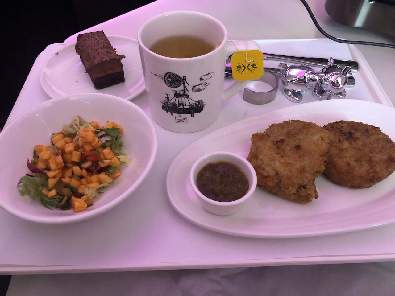 Knapp 90 Minuten vor der Landung wurde es wieder etwas lebendiger in der Kabine, der zweite Service startete. Wir bestellten wieder zwei Varianten- Crab Cakes und den High Tea. Sandwich und Wrap waren leider ziemlich labbrig, aber ok. Das Gebäck war 1A und die charmante Crew auch zum Abschluss der Reise immer noch motiviert und gut gelaunt.