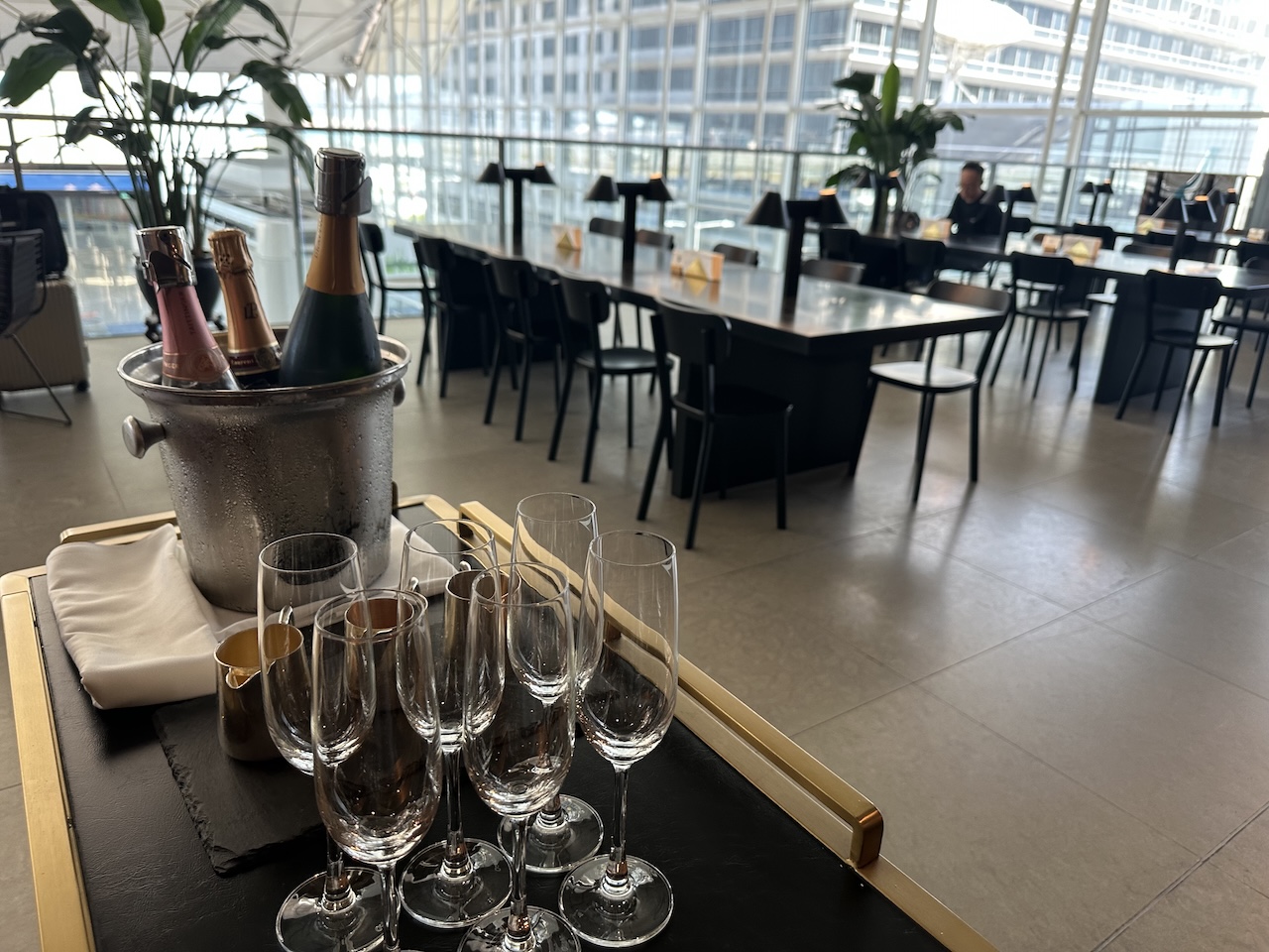 Die Lounge war nicht sehr voll, das Personal hatte also ausreichend Zeit, um sich um die Gäste zu kümmern. Wir haben uns zunächst an einen Tisch gesetzt und sofort einen Champagner angeboten bekommen. Auch Wein und Wasser wurde bei den anderen Gästen regelmäßig von einem der Kellner aufgefüllt, ohne überhaupt etwas sagen zu müssen.