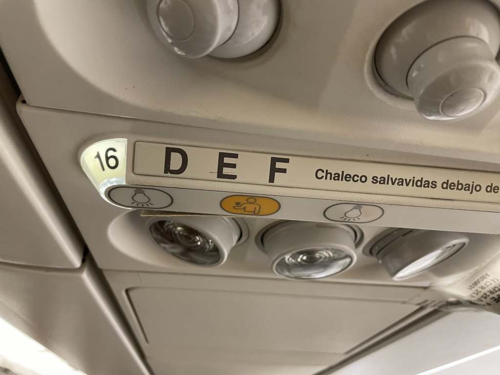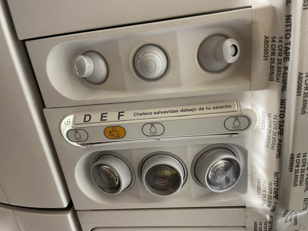 Über den Sitzen sorgen Luftdüsen für individuelle Belüftung des Platzes. Natürlich fehlen auch Leseleuchten und der Rufknopf nicht. Mein Sitz verfügte außerdem noch über ein spezielles Feature. Die Verkleidung über mir war mit „Nitto Tape“ bezeichnetes Klebeband dekoriert. Die Frage, warum das so ist, habe ich schnell verdrängt.