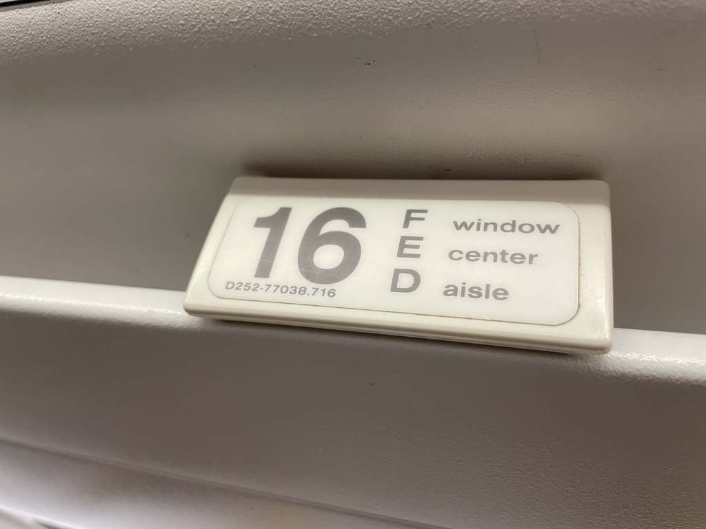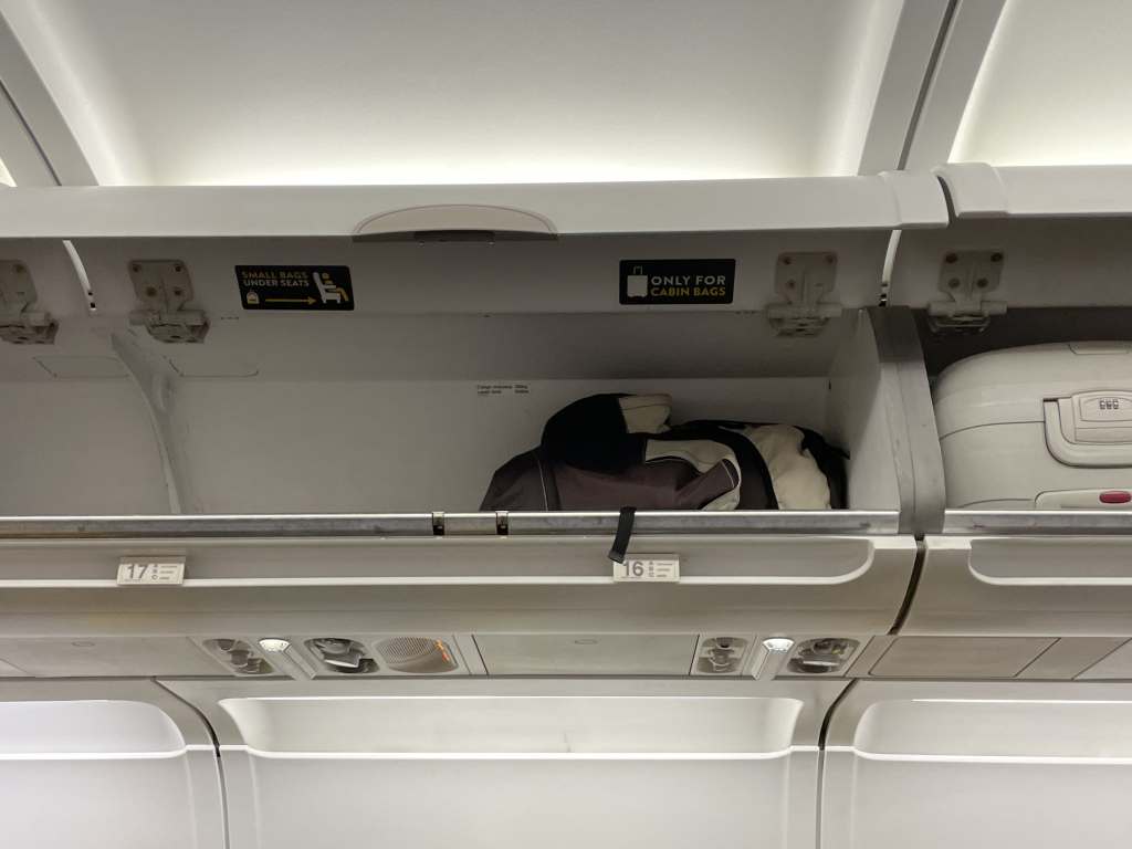 Als ich meine Sitzreihe 16 erreichte, war diese noch nicht belegt, ebenso wie das Gepäckfach über mir. Da mein Handgepäck beim Scannen der Bordkarte auch ein Cabin Baggage-Tag erhalten hatte, verstaute ich meinen Weekender nicht unter dem Vordersitz, sondern in dem leeren Gepäckfach über mir.