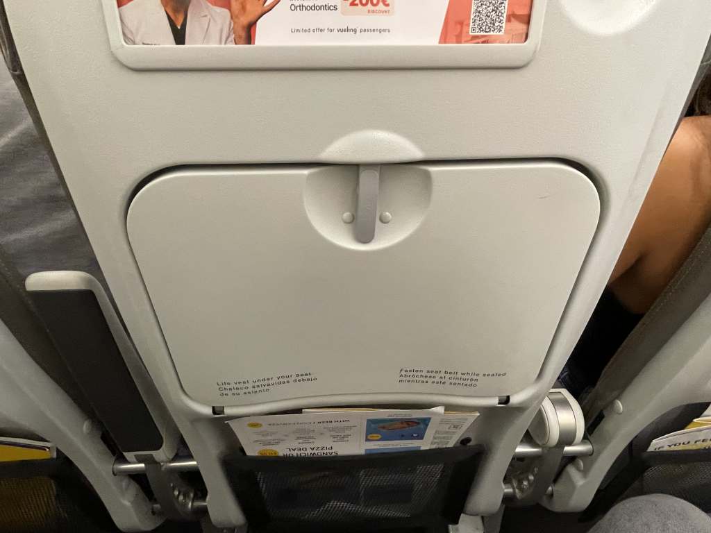 An den Vordersitzen befindet sich jeweils ein ausklappbarer Tisch, eine Sitztasche und ein Kleiderhaken. In der Sitztasche befindet sich natürlich die Sicherheitskarte. Außerdem findet ihr hier das Angebot an kostenpflichtigen Speisen und Getränken.