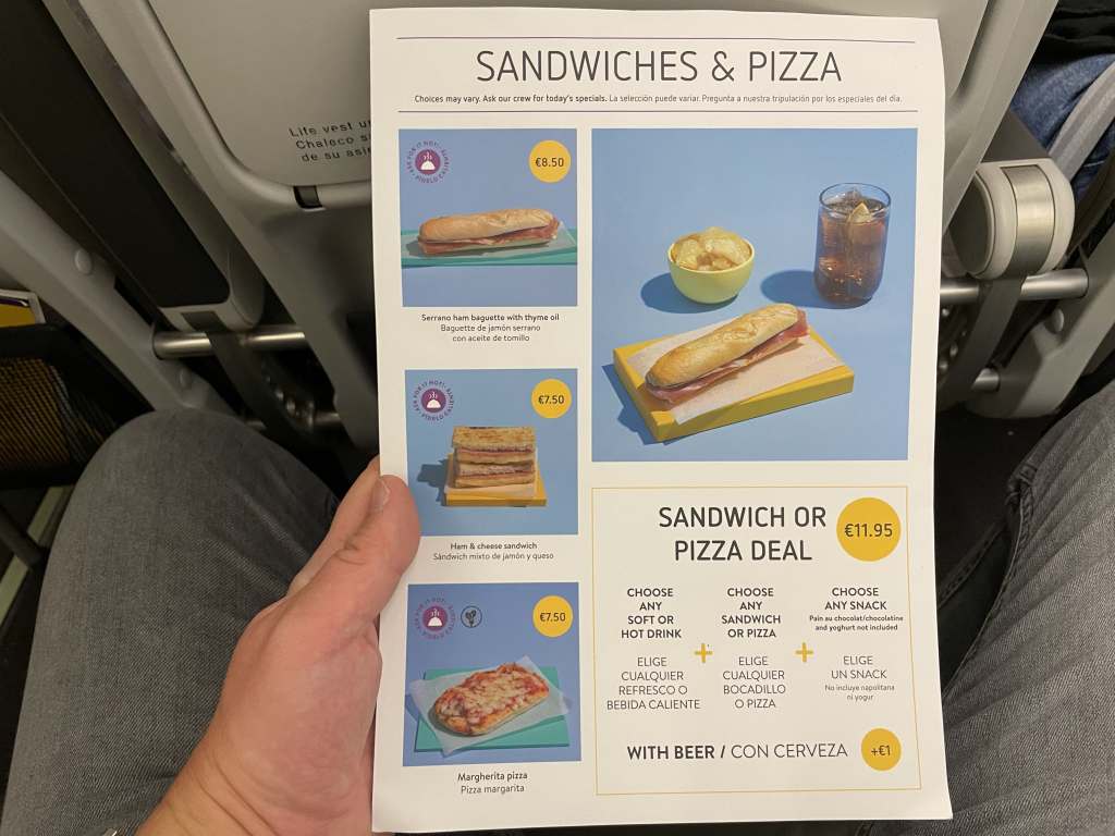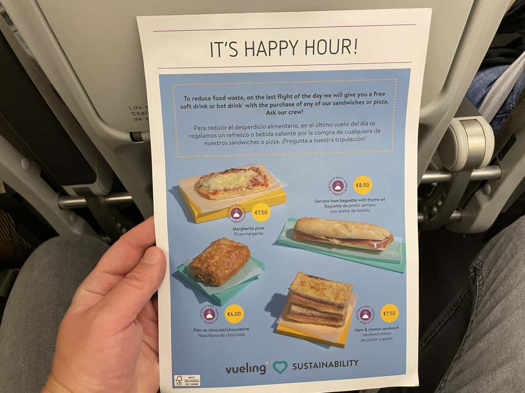 Vueling setzt als Low-Cost-Carrier auf den Bordverkauf. In der Sitztasche befindet sich die Karte für alle Speisen und Getränke, die während des Fluges angeboten werden. Selbst auf einer Ultra-Kurzstrecke wie von Palma de Mallorca nach Valencia geht das Kabinenpersonal von Vueling durch die Reihen und bietet Speisen sowie Getränke an.