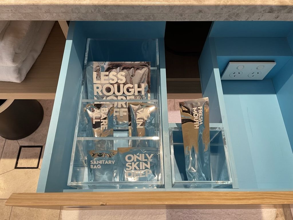 Und wie es sich für ein Luxus Hotel gehört, waren im Badezimmer auch eine ganze Reihe von Amenities in einer Schublade versteckt. Was man vergessen haben könnte, egal ob Zahnbürste, Rasierer, Bürste oder Nagelfeile, es war bereits auf dem Zimmer.