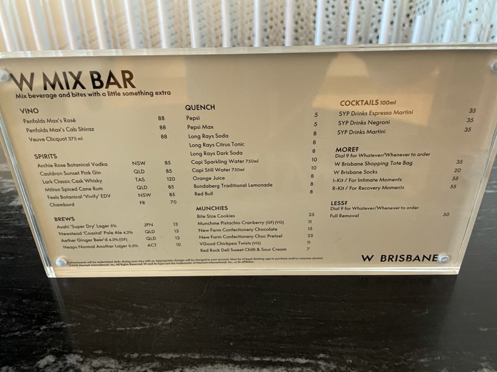 Wenn man beim W Brisbane im Service etwas kritisieren will, dann dass kein Welcome Amenity auf dem Zimmer war. Dieses wollte man mir am Nachmittag aufs Zimmer bringen und hier hatte ich gerade geschlafen und damit das „Bitte nicht stören“ an gemacht. Leider hat man es am späten Abend oder am Morgen nicht noch einmal versucht und mir auch keine Nachricht auf dem Zimmer hinterlassen, dass ich mich melden könnte. Lediglich beim Check-Out hat man es mir gesagt, dass es hier eine Nachricht gäbe.
