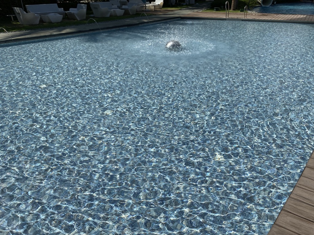 Auf dem selben Geschoss befindet sich auch der großzügige Pool, welcher mit ausreichend Liegen und Schirmen ausgestattet ist. Besonders hervorzuheben ist für uns hier der Wasserspender. Den kompletten Tag über stand hier kostenfreies gekühltes Wasser zur Verfügung.