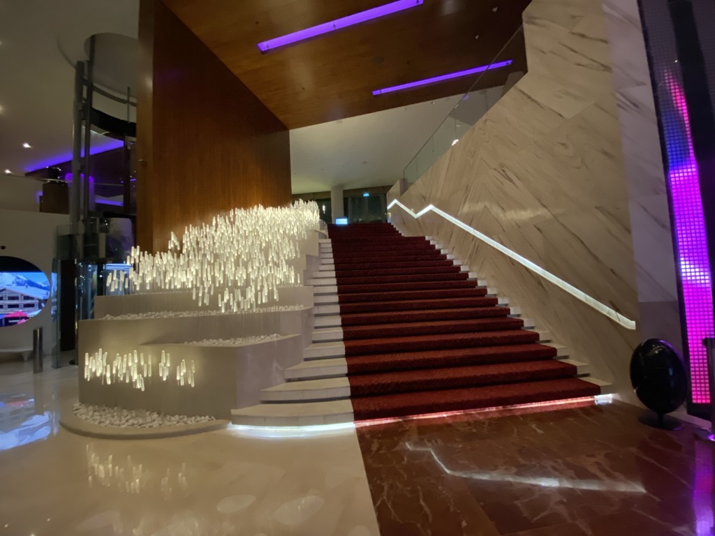Mit einem Aufzug oder über eine Treppe gelangt man in die eigentliche Lobby, welche im ersten Stockwerk liegt. Hier wurden wir erneut freundlich begrüßt und zügig eingecheckt. Christoph hat bereits vorab in der App Suite Night Awards hinterlegt, um für unseren Aufenthalt eine Suite zu erhalten. Diese Möglichkeit hat man durch 50 qualifizierende Nächte im Marriott Bonvoy Programm – Alexander hat dies bereits ausführlich erklärt.