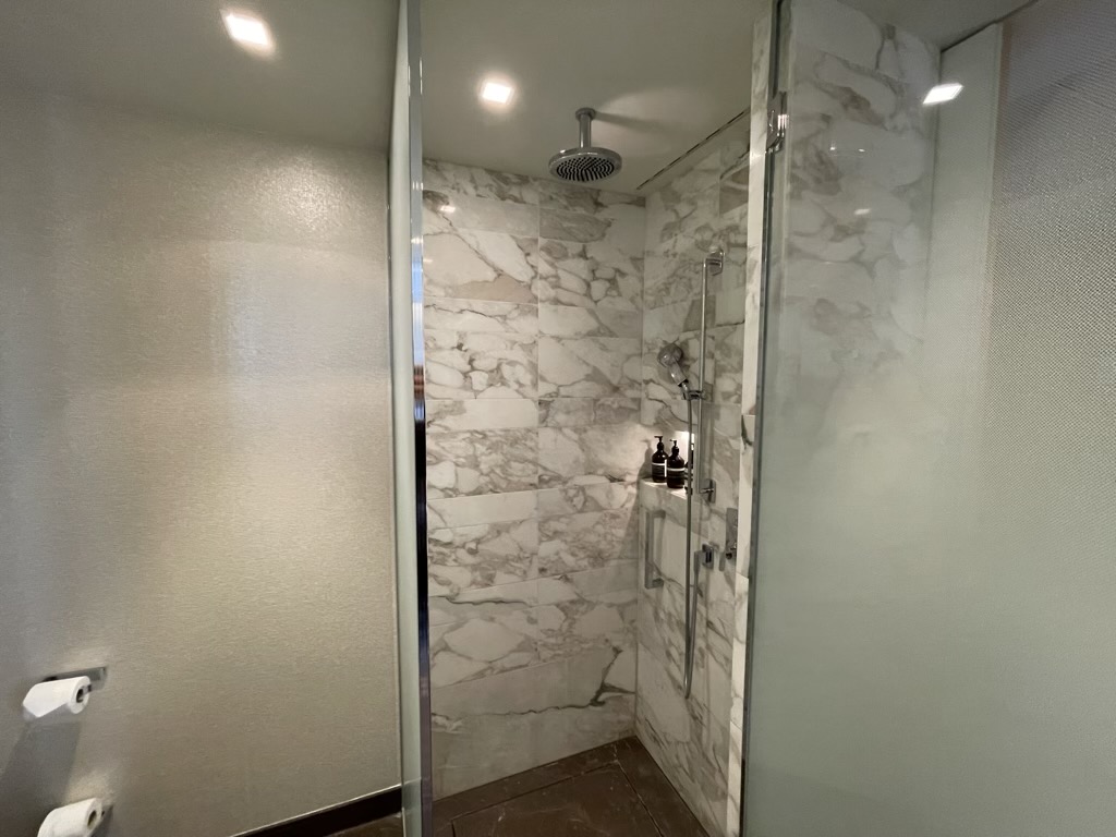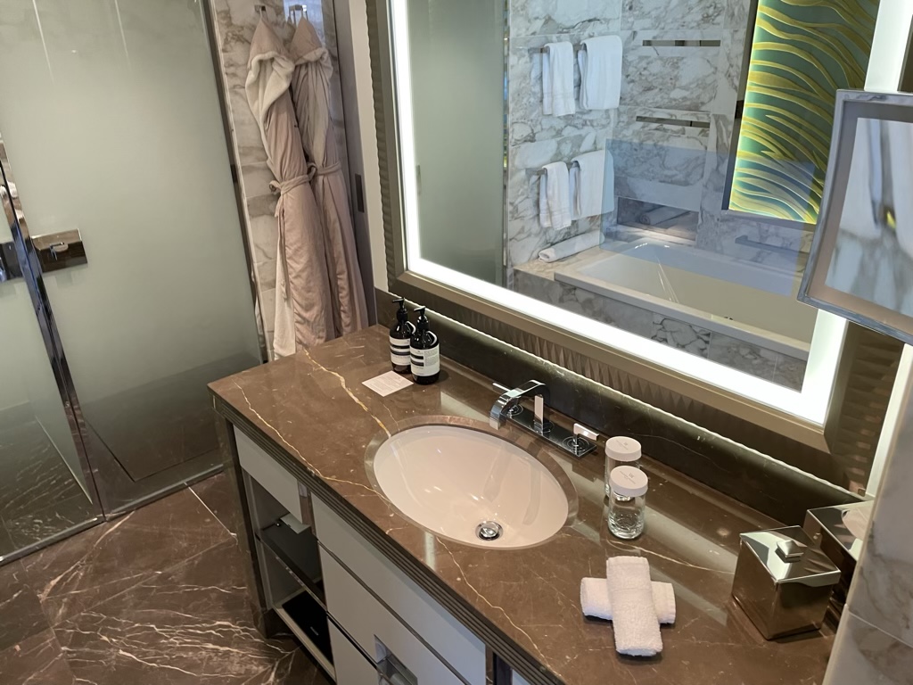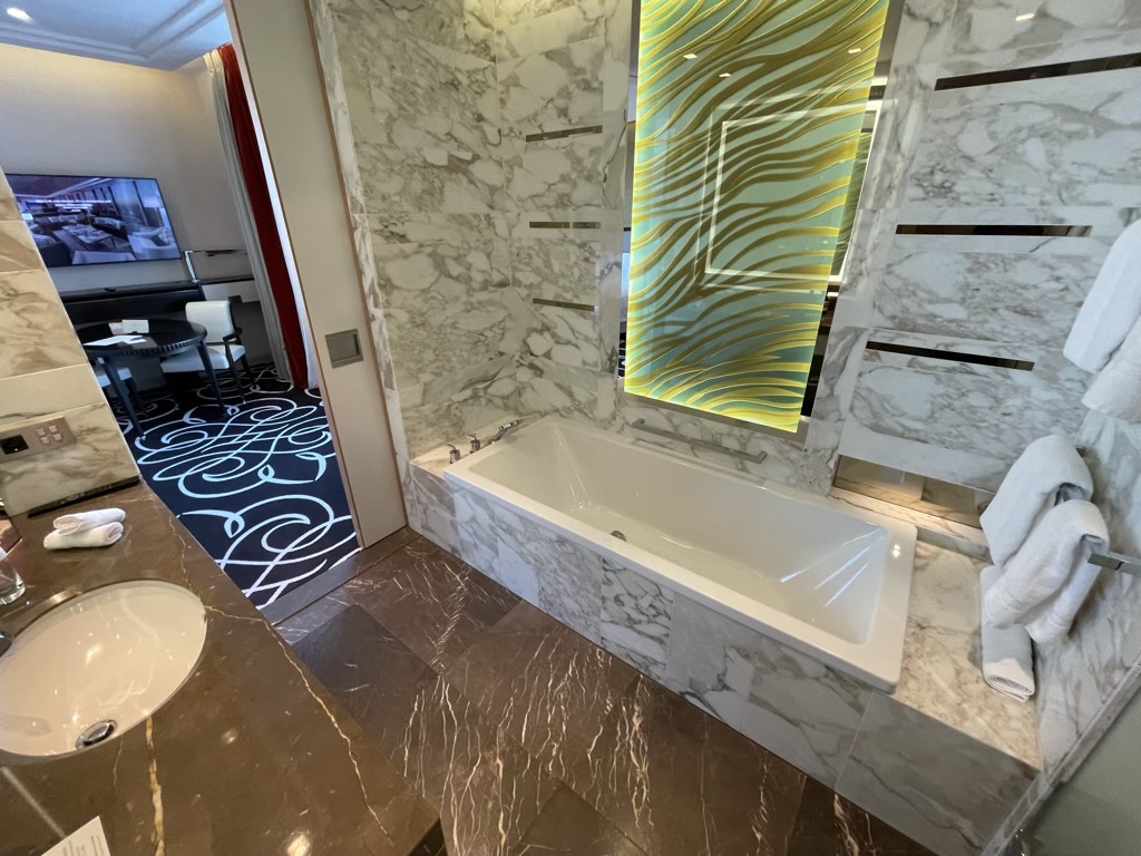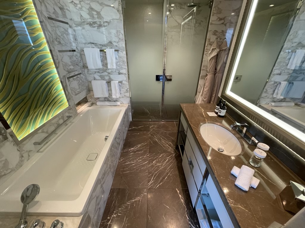 Das Bad ist überdurchschnittlich groß und mit dem weißen Marmor auch schön, sowie hochwertig gestaltet. Alleine, dass man neben der Dusche auch eine Badewanne hat ist absoluter Luxus