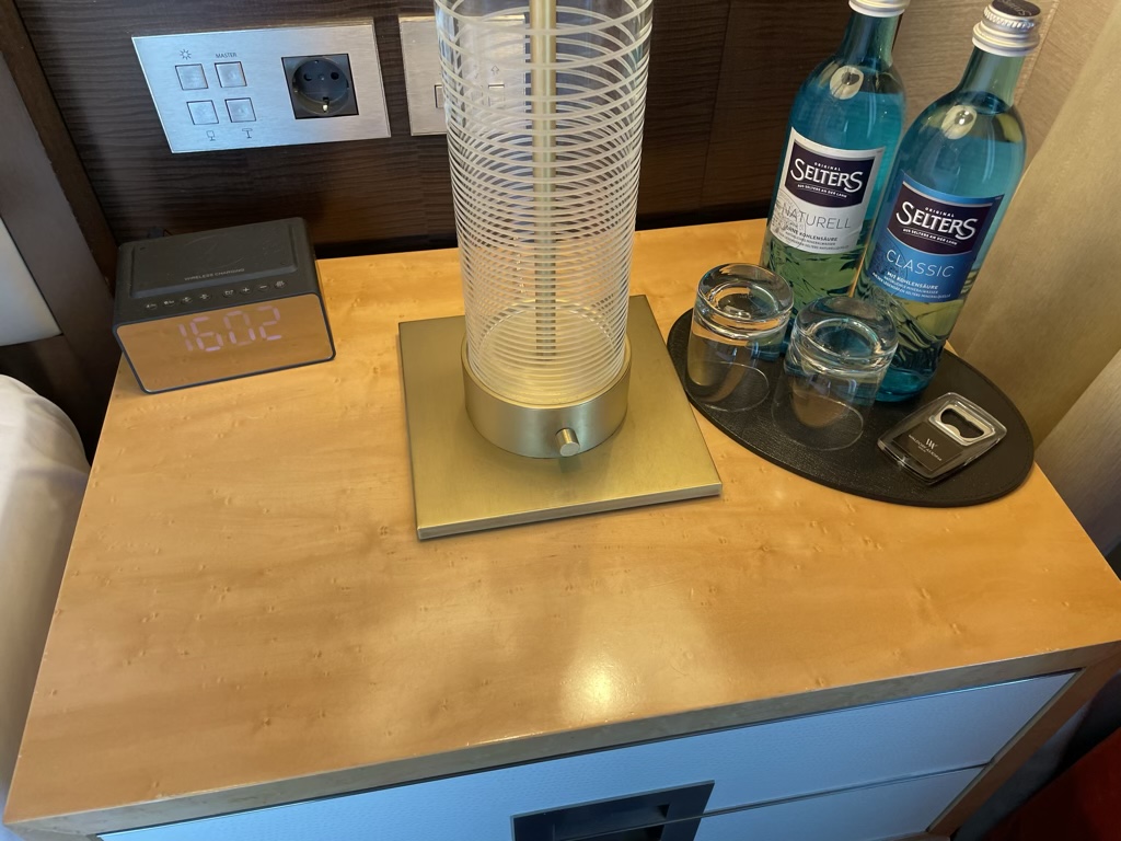 Ansonsten gibt es über dieses Zimmer nicht viel zu berichten, außer dass man hier an die Kleinigkeiten gedacht hat, die sonst so sehr stören können wenn sie fehlen, wie eine Steckdose am Bett und alle Lichter lassen sich von hier bedienen. Auch Wasser (Still und Classic) bekommt jeder Gast ans Bett gestellt, was ich liebe und beim Turn Down Service am Abend wurden diese auch noch einmal ausgetauscht, wie es sein muss.