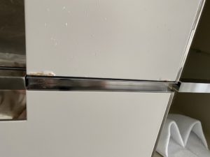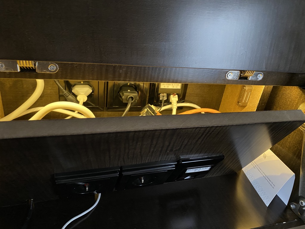 Direkt nach dem Betreten war auf der rechten Seite ein großzügiger Einbauschrank eingebaut, in dem unter anderem der Safe und Bademäntel untergebracht waren. Auf der linken Seite des Zimmers stand ein kleiner Schreibtisch, an dem man arbeiten konnte. Im Sideboard daneben waren Steckdosen und USB-Anschlüsse untergebracht. Hier fiel uns das erste mal auf, dass das nicht jeder Einrichtungsgegenstand im Zimmer intakt war.