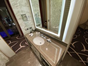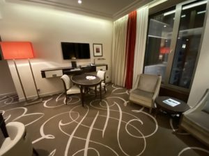 Am Abend unseres Anreisetages, kamen wir gegen 20 Uhr in der Lobby an und wurden freundlich begrüßt. Schnell waren alle Formalitäten erledigt. Als HiltonHonors Diamond Member bekommt man in der Regel ein Upgrade, sofern es die Verfügbarkeit zulässt. In einem Nebensatz erfuhren wir sehr schnell, dass die Auslastung des Hotels aufgrund der Absage bei nur etwa 35% lag. Entsprechend wurde uns ein Upgrade auf eine Suite zugewiesen, allerdings leider ohne View. Eine für uns wirklich eigenartige Upgradepolitik, dass man den Wechsel von einem explizit mit View gebuchten Zimmer auf eine Suite ohne View als „tolles und extrem zuvorkommendes Upgrade“ verkauft.