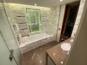 Das Badezimmer war neben einer Dusche mit Regenduschkopf auch mit einer separaten Toilette, einer Badewanne mit Ausblick und einem Waschbecken ausgestattet. Bei einem Hotel dieser Kategorie haben wir uns in einer Suite definitiv ein Doppelwaschbecken erhofft, sind aber auch gut mit dem vorhandenen klar gekommen. Auch der Schrank, welcher unter dem Waschtisch verbaut war, war schadhaft. Hier hat sich die Verkleidung abgelöst.