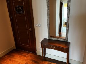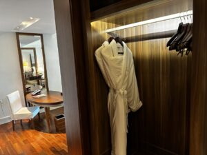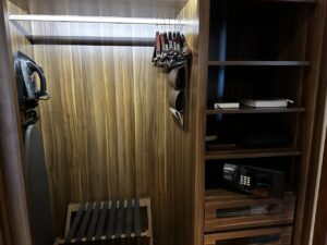 Zwischen Bad und Wohnzimmer war ein begehbarer Kleiderschrank wobei es hier verhältnismäßig wenig Platz für einen geschweige denn zwei Koffer gab. Bügeleisen, Safe, Bademäntel, Slipper usw. sind selbstverständlich.