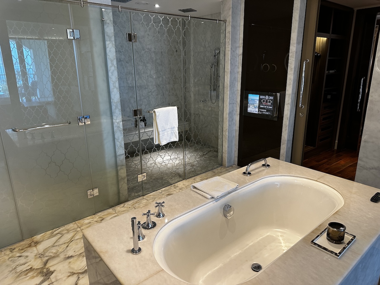 Das Bad war auch riesig, darin eine freistehende Badewanne und eine große Dusche mit gleich zwei Duschköpfen.