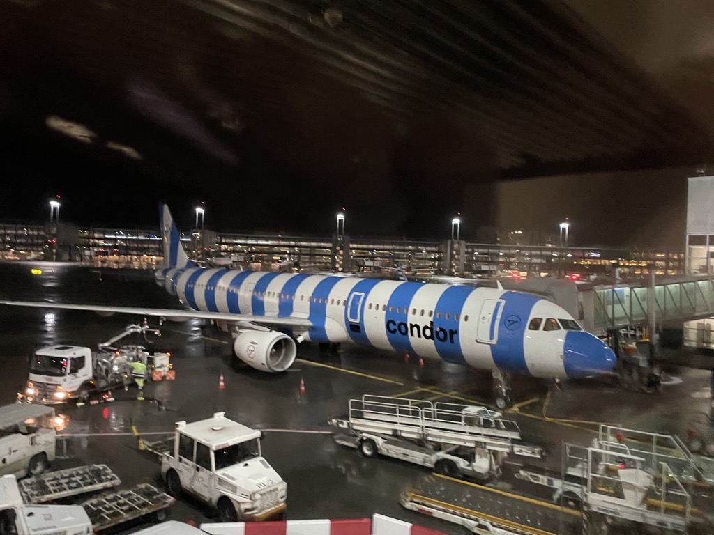 Die Sicherheitskontrolle an diesem Morgen war sehr schnell und effizient, was auch daran lag, dass bei dem Abflug von vor 5 Uhr morgens nur die Passagiere von zwei Condor Flügen durch die Sicherheitskontrolle in Frankfurt gegangen sind. Auch wenn ich recht knapp zum Flughafen gekommen bin, hatte ich keine Probleme zu meinem Gate A24 zu kommen, wo ich noch ein paar Minuten den Anblick auf den frisch im neuen Condor Streifen Design lackierten Airbus A321 zu genießen.