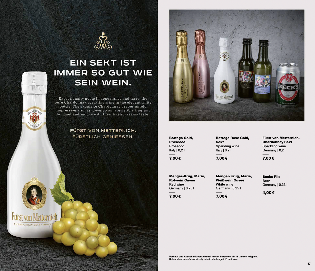 | Champagner: | „Fürst von Metternich“ Riesling Sekt UND „Bottega Prosecco“ gegen Bezahlung |