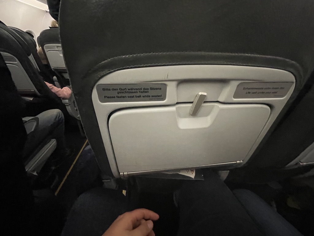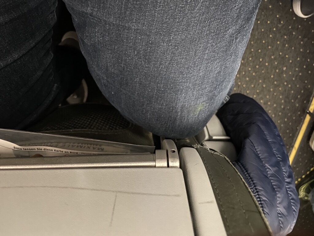 Die Ledersitze sind grundsätzlich durchaus bequem und für die kürzeren Flüge in Europa ausreichend gut gepolstert, allerdings fand ich den Sitzabstand unangenehm eng und ich bin mit meinen Knien direkt am Vordersitz angeschlagen. Viel Freiraum hat man also nicht.