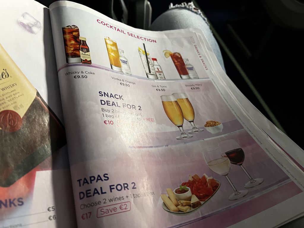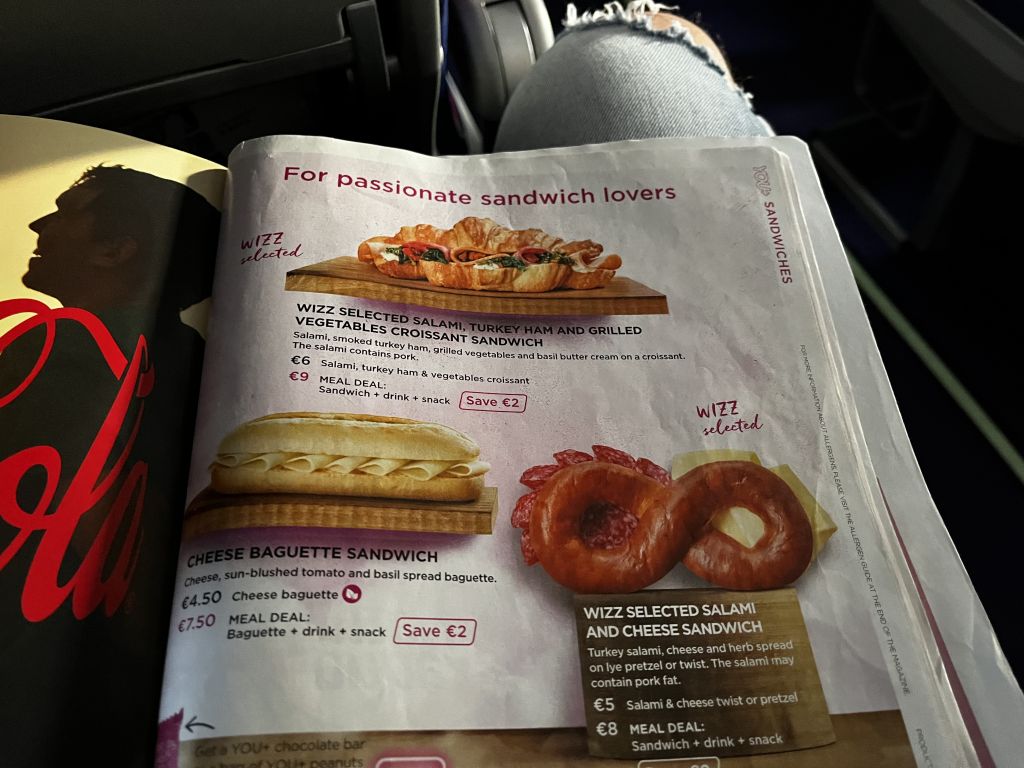 Wizzair bietet als Billigflieger an Bord natürlich nur Getränke und Snacks im YOU+ Cafe zum Verkauf an. Und während Ryanair in den vergangenen Jahre hier nachgebessert hat, ist das Angebot bei Wizzair eher zum abgewöhnen. So gib es primär ein paar lieblose Sandwiches und Instant-Suppen zum Preis von 3,50 bis 6 Euro. Die Menü-Optionen sind eher lächerlich, denn Ihr zahlt quasi den Normalpreis für Snack und Getränk und bekommt dann eine Mini-Tüte an Erdnüssen oder einen Mini-Schokoriegel im Wert von zwei Euro dazu.