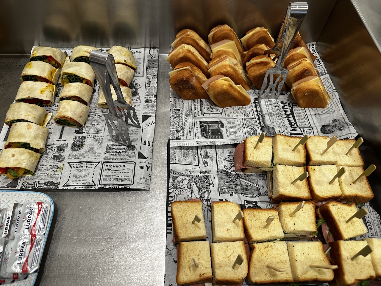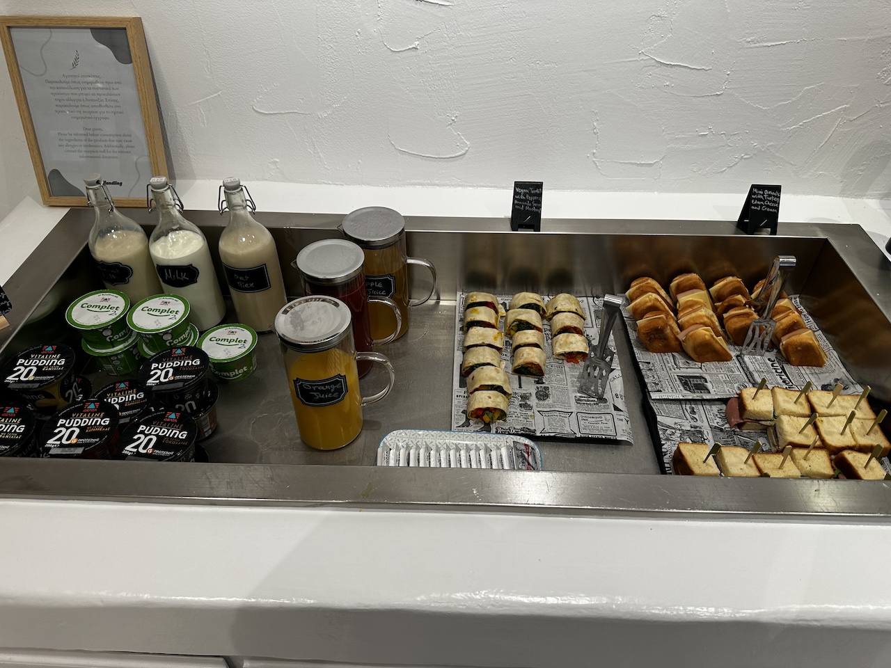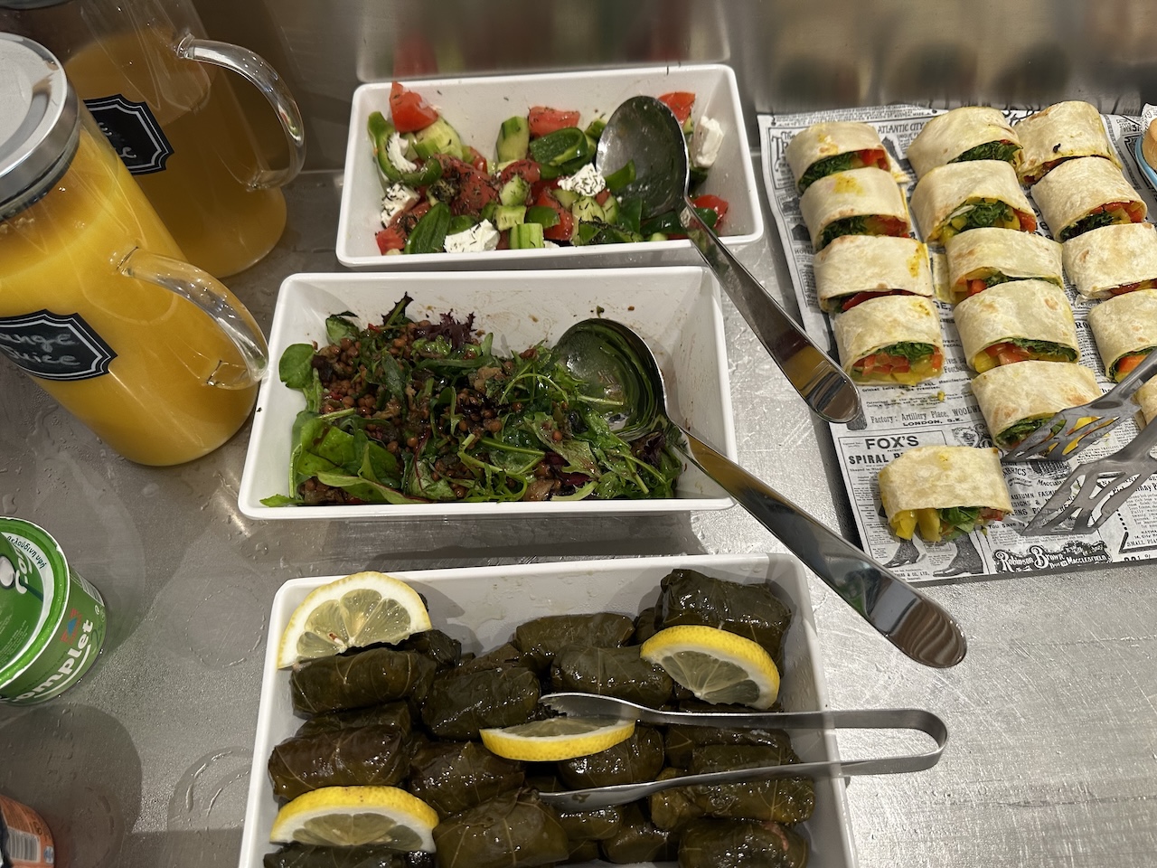 Etwas später wechselte das Angebot, zur Mittagszeit wurden auch Salat, gefüllte Weinblätter und Sandwiches bereitgestellt. Warme Speisen werden hier nicht serviert.