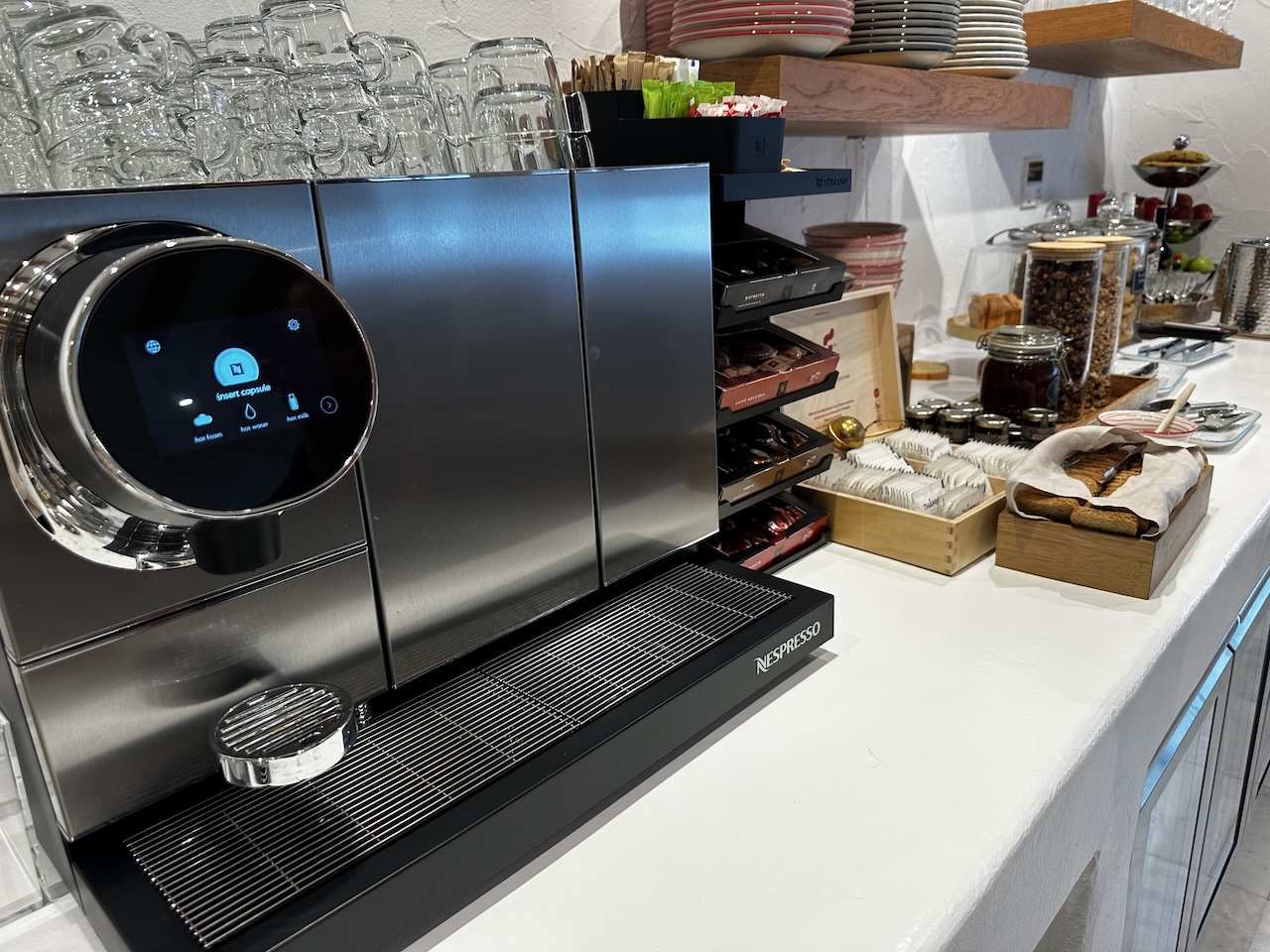 In einer Ecke ist das Buffet aufgebaut, dort findet Ihr eine recht gute Getränkeauswahl. Zum Angebot gehören diverse Softdrinks und Säfte, hier steht auch eine Kapselmaschine von Nespresso.