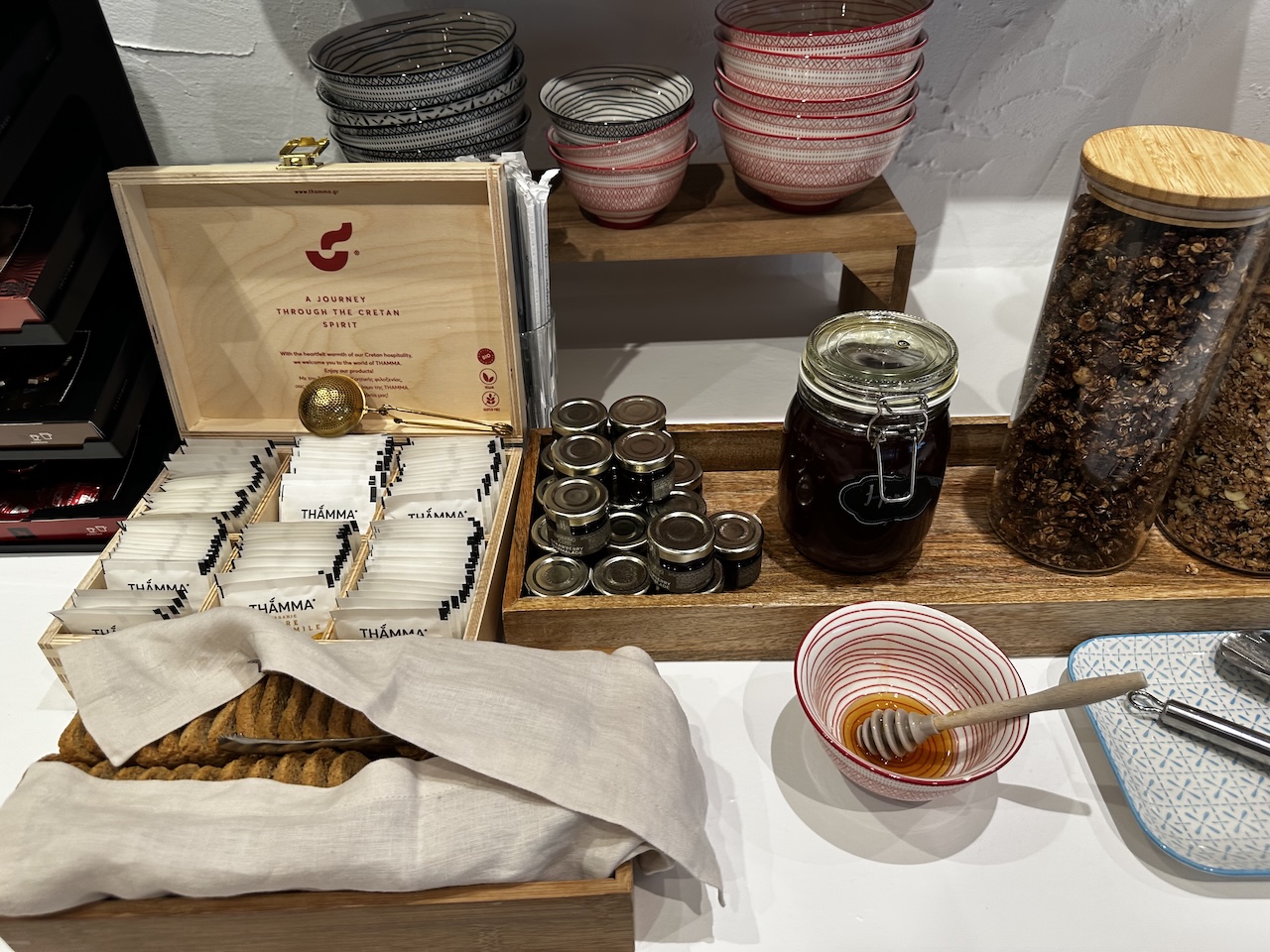 Wer Hunger hat, kann sich ein paar Knabbereien holen, es gab auch Obst und einige Frühstücksbestandteile samt Joghurt, Müsli und Brot.