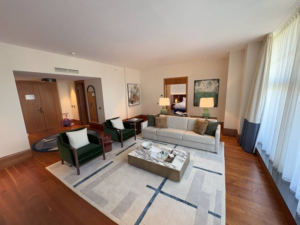 Die King Executive One Bedroom Suite wird mit einer Größe von 115 Quadratmetern, Wohnzimmer, Schlafzimmer mit Kingsize-Bett, einem begehbaren Kleiderschrank, Gäste-WC und einem Badezimmer mit Dusche und WC beschrieben. Die Angabe der maximalen Gäste ist dabei etwas verwirrend, da sie im Text mit maximal drei Gästen und in den Annehmlichkeiten des Zimmers mit vier Gästen angegeben wird. Vier sollte auch der Realität entsprechen, da die Couch, die sich zum Bett umkonfigurieren lässt, mehr als großzügig dimensioniert ist.